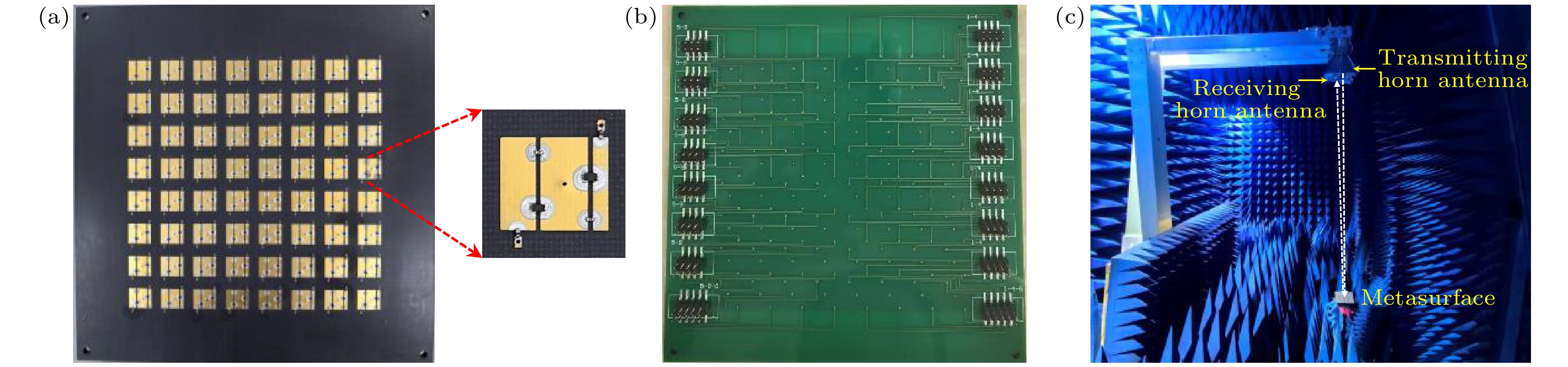 Figure 13.  Picture and test of the metasurface with 8 × 8 elements: (a) Top view; (b) back view; (c) test in the anechoic chamber.