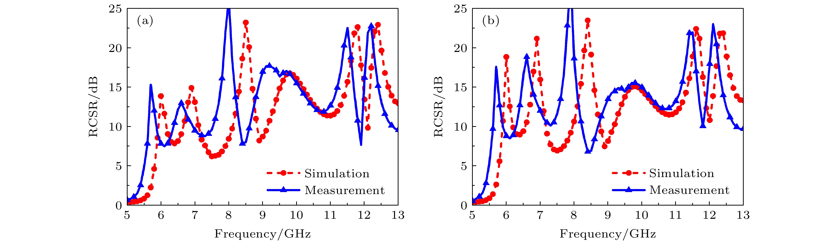 针对上述问题, 本文提出了一种超宽带的频率和相位复合可重构超表面单元设计方法. 该方法在超表面单元中使用多个PIN二极管, 在连续的频带内产生多个1比特反射相位, 结合频率和相位可重构, 扩展了单元的有效相移带宽. 此外, 通过电流分析, 引入集总电容并优化其位置, 精准调控电流分布, 克服了常见PIN二极管易产生的高损耗问题, 实现了单元的宽带低损耗性能. 采用该方法设计了一款超宽带1比特相移超表面单元, 并构造了16 × 16单元的超表面, 在宽频带上验证了其散射场调控能力和宽带低雷达散射截面(radar cross section, RCS)性能.