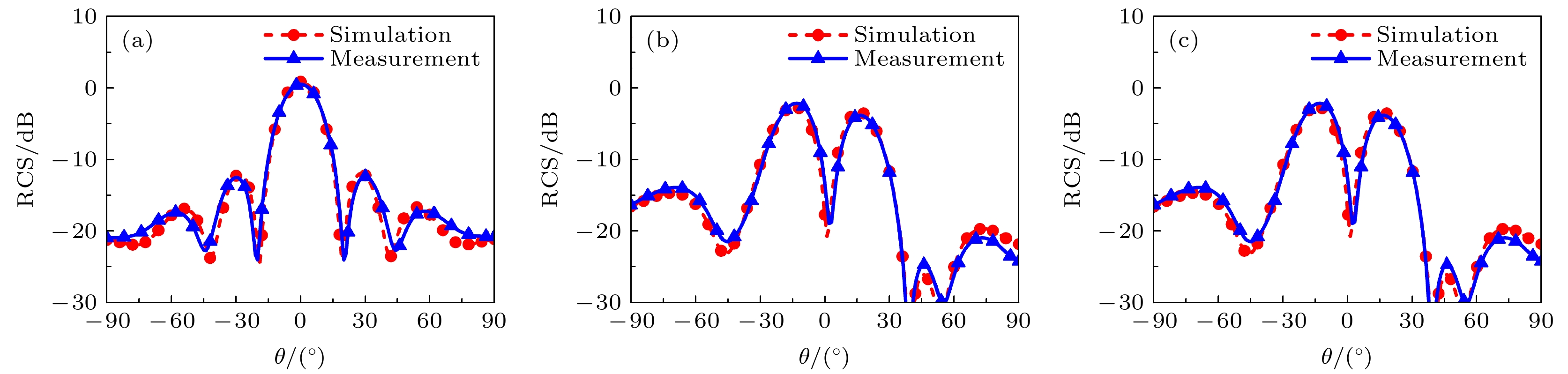 • 为了验证设计宽带可重构超表面的有效性, 采用印刷电路板技术加工了超表面实物. 与上述分析不同的是, 为节省成本, 实际加工的超表面包含8×8个单元, 样件的正面及背面照片如图13(a)图13(b)所示. 在微波暗室中, 采用空间波法进行测量. 测试环境如图13(c)所示, 两个工作频段为1—18 GHz的喇叭天线分别连接到矢量网络分析仪Agilent P5007A的两个端口上, 其中一个天线发射电磁信号, 另一个接收经待测样品反射的信号, 两个天线的中心都指向待测超表面的中心. 实验中, 使用FPGA控制电路板控制每个PIN管的导通或截止状态, 分别测量超表面和相同尺寸金属板的散射能量. 测试得到超表面相较于金属板的RCS减缩的结果, 如图14所示, 图中还给出了按照8 × 8个单元重新仿真的RCS减缩结果作为对比. 由图14可知, 对于两种相位排布, 测量结果较仿真结果都向低频偏移了约0.4 GHz, 这很可能是由介质材料误差和集总电容误差导致的. 总体上看, 实验测试和仿真得到的RCS减缩量与趋势符合较好. 为了进一步验证设计超表面的波束调控能力, 计入实测结果的频偏效应, 图15将8.1 GHz的实测结果与仿真得到的8.5 GHz的散射方向图进行了对比. 由图15可以看到, 仿真结果与测试结果总体吻合较好. 实测结果验证了提出超宽带可重构超表面的性能, 也证实了单元设计方法的有效性.