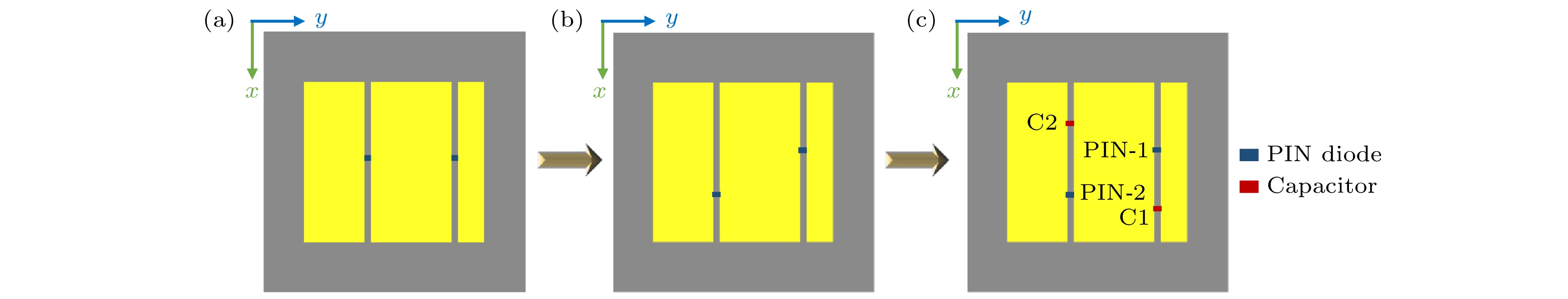 图 2  超表面基本单元演变过程 (a) 1比特单元; (b) 频率可重构1比特单元; (c) 低损耗频率可重构1比特单元