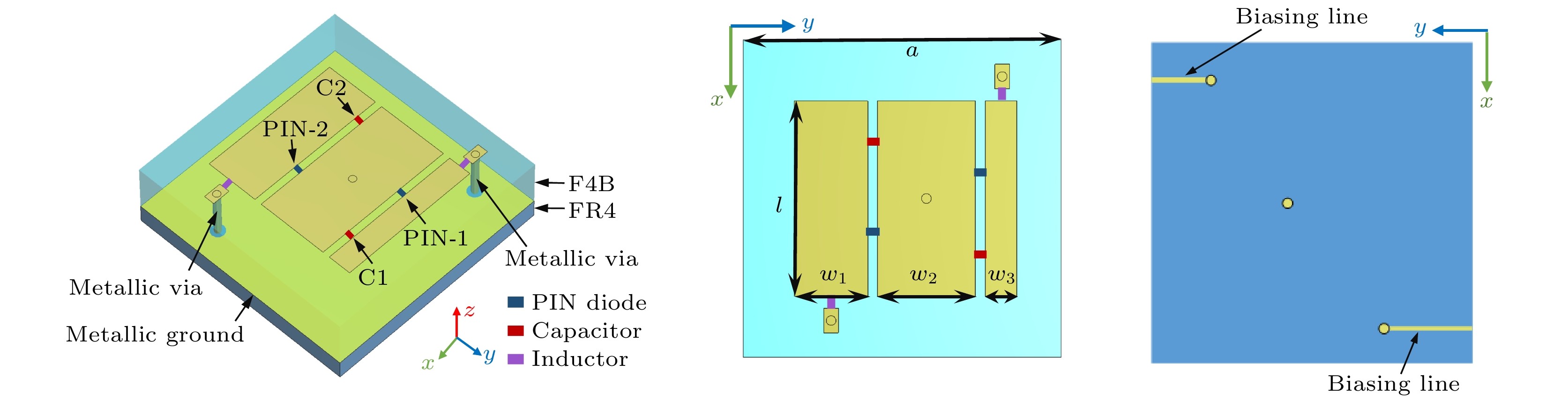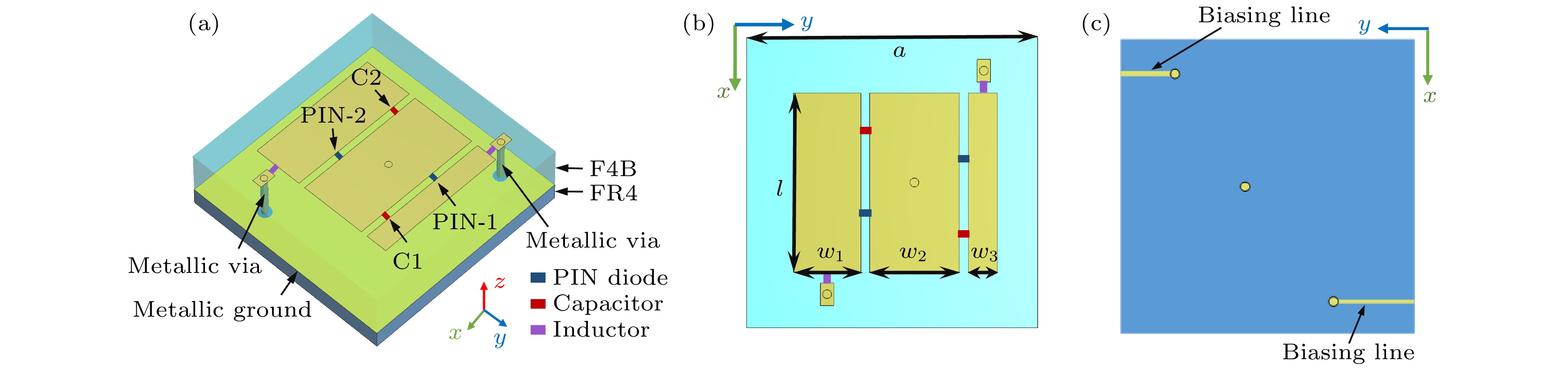 针对相位可重构超表面单元带宽窄的问题, 研究者们已经提出了一些方法. Zhou等[27]设计的单元使用双层介质基板和金属贴片, 具备多谐振特性, 单元的相对带宽达到23.8%. Li等[28]将两个寄生贴片引入到初始可重构单元的两侧, 通过耦合分流减小了单元损耗, 同时增加了新的谐振点, 使单元的相移带宽达到50%. 卢颖娟等[29]通过在可重构超表面单元金属贴片两侧引入凹槽结构, 巧妙地延长了电流路径, 将相移带宽提升至62.3%. Li等[30]通过引入分流电容, 设计了一种宽带相位可重构超表面单元, 其相移带宽达到72.3%. Shi等[31]提出一种宽带可重构智能表面, 其单元通过控制PIN二极管通断使金属光栅贴片等效为单电偶极子或双电偶极子, 从而具有多谐振特性, 由此获得74.3%的相移带宽. 上述探索性的研究都成功实现了宽带性能, 但也存在一些限制, 比如, 增加了单元的厚度或结构复杂度. 近年来, 超表面的多频工作性能受到了研究者们的关注. 具有多频工作性能的超表面不仅能够扩展自身的工作带宽, 还在多频复用等场景具有应用潜力[3236]. 这些超表面展现出的多带宽性能, 为解决相位可重构超表面工作带宽窄的问题提供了新途径, 但报道中给出的设计结构或控制方式往往相对复杂, 且实现的多频带大多不连续, 无法直接用于实现宽带性能.