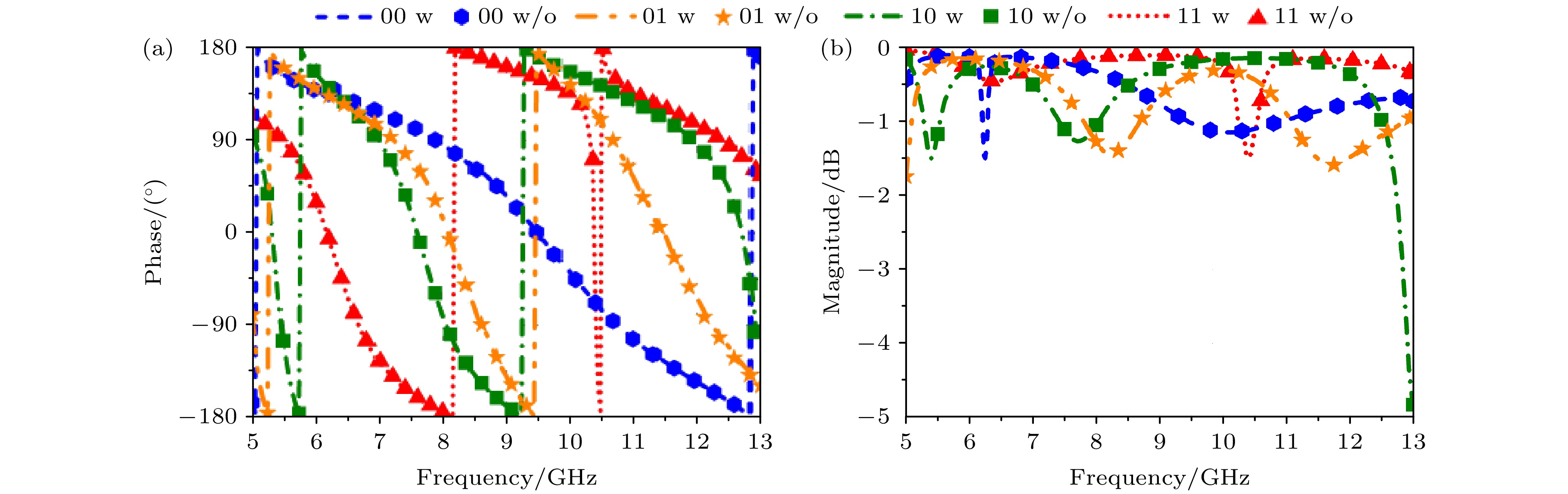 表1比较了本文与文献中的相位可重构表面的单元性能. 相较于已有文献中的超表面单元, 本文提出的1比特相位调控超表面单元有3个突出特点: 一是同时具有相位和频率调控功能, 可以适应更灵活、功能要求更多的应用场景; 二是具有最宽的可重构相移频带, 这为设计宽带相位可重构超表面提供了新思路; 三是使用单层超薄介质实现了宽带特性, 厚度为0.09λ, 具备重量轻、低成本、易集成等优势.