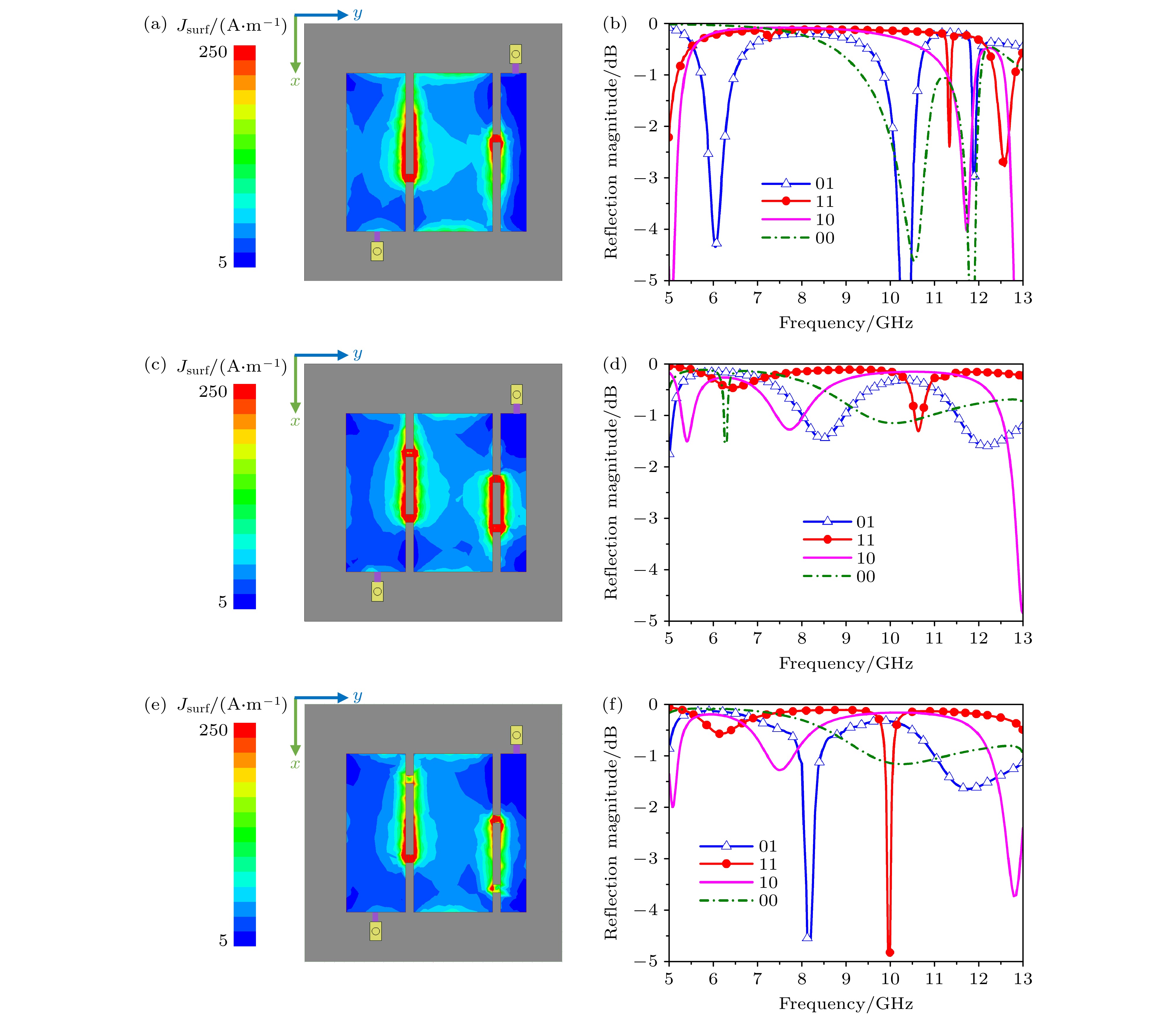 为了说明电容对减小单元损耗的作用, 图5对比了超表面单元有无电容时的表面电流分布. 当无电容时, 单元的表面电流分布如图5(a)所示, 金属表面的感应电流沿着两个PIN二极管流动. 此时, 单元的反射幅度如图5(b)所示, 可以看出, 在5—13 GHz出现了多个谐振点, 且在这些频点的反射损耗超过4 dB, 这是由PIN二极管的等效电阻吸收了部分电磁能量造成的. 当对二极管并联电容后, 利用电容隔直流、通交流的特点, 实现了射频电流“分流”, 如图5(c), 减小了流经PIN二极管的电流. 此时, PIN二极管的“损耗”作用将减弱, 结合图5(d)所示, 证实了单元的损耗有明显减小. 当改变电容的位置时, 结合图5(e)图5(f)所示, “分流”作用和损耗性能也会随之改变, 由此, 通过优化电容与二极管的位置, 可以有效地调控流经二极管的电流大小, 进而实现单元的低损耗性能.