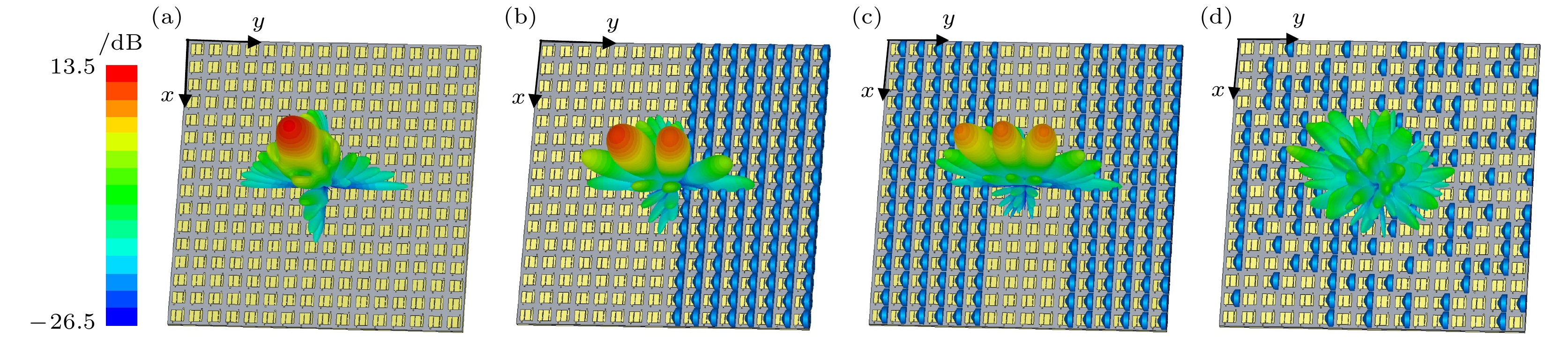 Figure 7.  Different scattering patterns of the metasurface at 9 GHz: (a) Single beam; (b) double beam; (c) triple beam; (d) diffuse scattering.