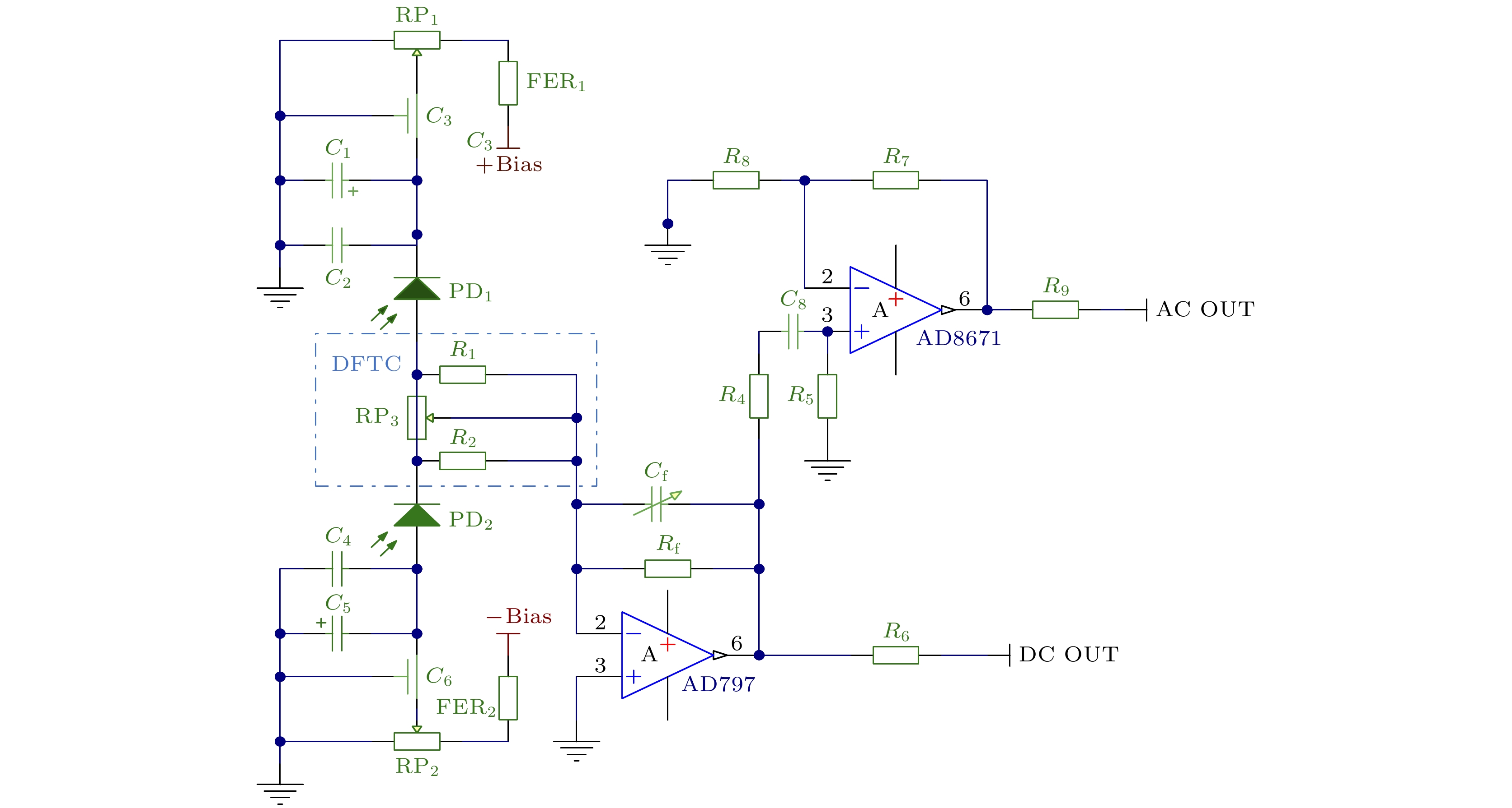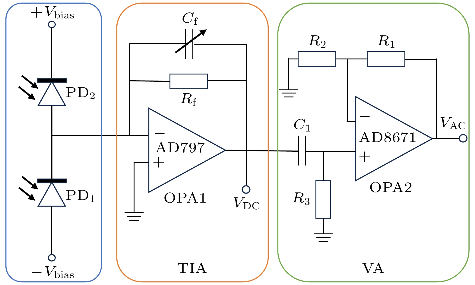 Figure 1.  Schematic diagram of the balanced detector based on TIA. OPA1/2, operational amplifier 1/2; PD, photodiode; Vbias, bias voltage; VAC, AC voltage signal; VDC, DC voltage signal.