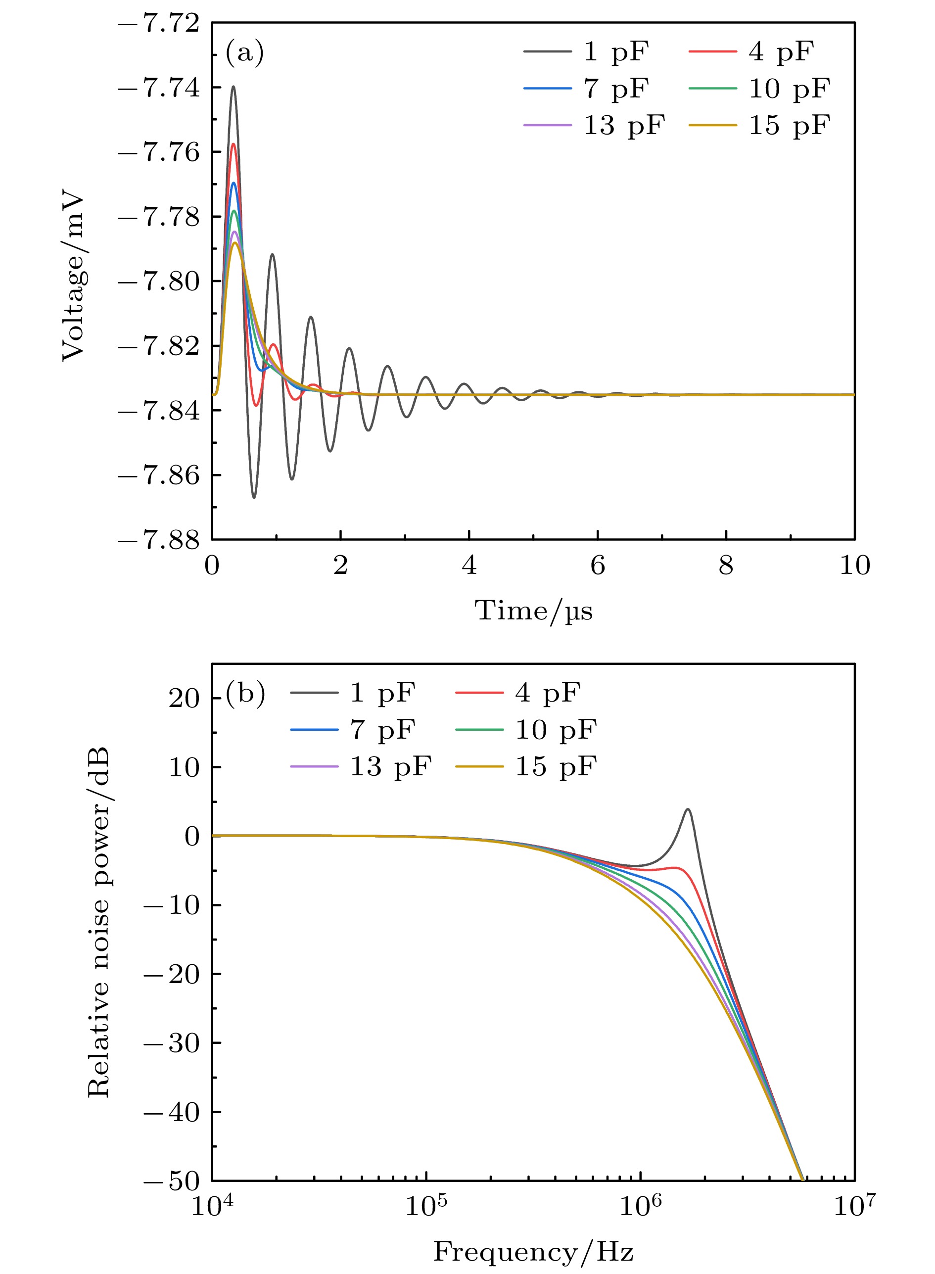 在低频压缩态光场探测实验中, 系统首先需要在高频段(1 MHz量级)实现相位及压缩角的精确锁定, 确保系统锁定至最佳状态后再通过切换频率至低频段进行量子噪声测量. 上述探测方案对平衡光电探测器提出了双重性能要求, 不仅要求在低频段需要良好的噪声性能, 同样需要在MHz频段具有良好的频率响应特性. 针对平衡光电探测器在MHz频段的频率响应研究, 我们使用LTspice仿真软件模拟了不同反馈电容${C_{\text{f}}}$对电路时域和频域的影响, 实验结果如图4所示. 我们使用100 ns的脉冲宽度的光信号, 设置光电流的上升时间和下降时间为50 ns, 即${T_{\text{R}}}$${T_{\text{F}}}$设定为50 ns; ${I_1}$设置为10 nA, 来模拟光电二极管的暗电流, 光电流${I_2}$设置为5 μA, 扫描时间设置为10 μs. AC端输出结果时域图如图4(a)所示, 反馈电容${C_{\text{f}}}$取值分别为1, 4, 7, 10, 13和15 pF. 由图4(a)分析可知, 随着补偿电容${C_{\text{f}}}$容值从1 pF增加到15 pF, 输出脉冲的幅度呈现显著衰减趋势. 频域如图4(b)所示, 当反馈电容为1 pF时, 在较高频段(约1.8 MHz处)放大器产生响应尖峰, 导致响应曲线的不平坦. 随着补偿电容增大, 高频增益尖峰逐渐平缓, 说明可通过补偿电容调节来有效抑制高频极点的不稳定性, 综合考虑信号跨阻增益与频率响应曲线, 最终选择使用10 pF的可调电容进行后续实验.