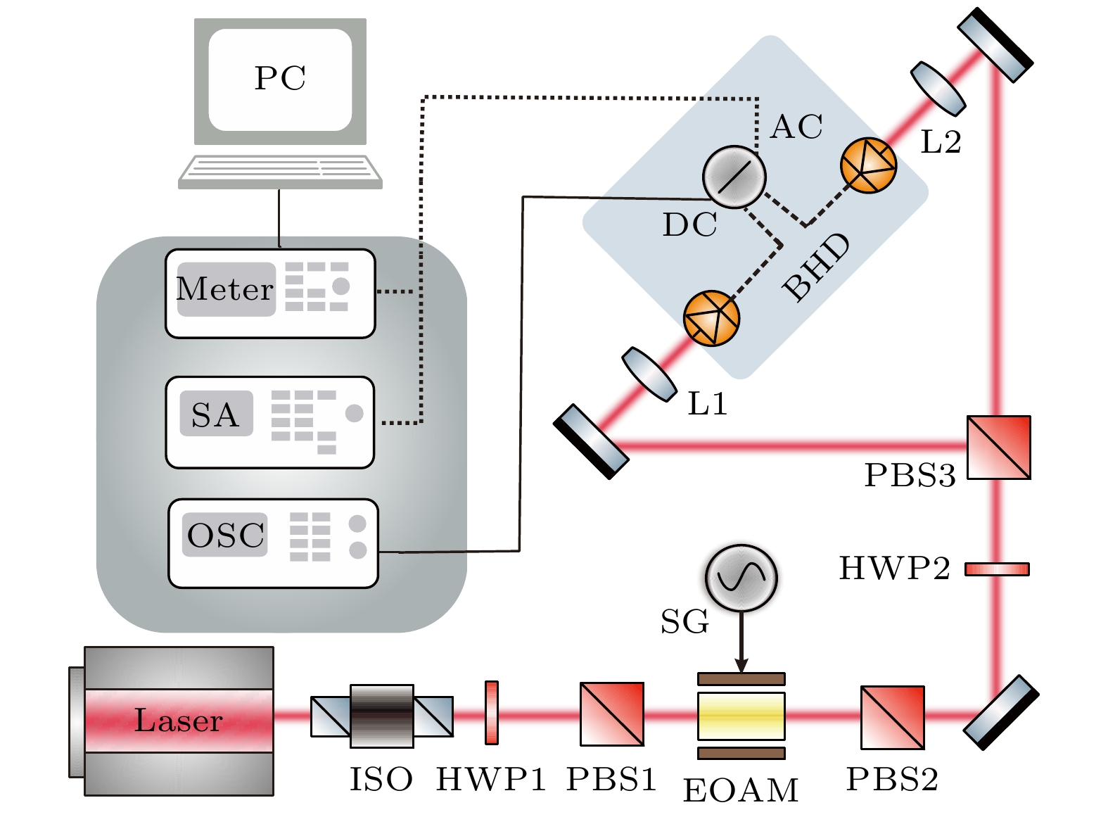 Figure 5.  Balanced detector performance test and evaluation device. ISO, isolator; HWP, half-wave plate; PBS, polarization beam splitter; EOAM, electro-optic amplitude modulator; SG, signal generator; BHD, balanced homodyne detector; SA, spectrum analyzer; OSC, oscilloscope; Meter, high-precision digital multimeter.