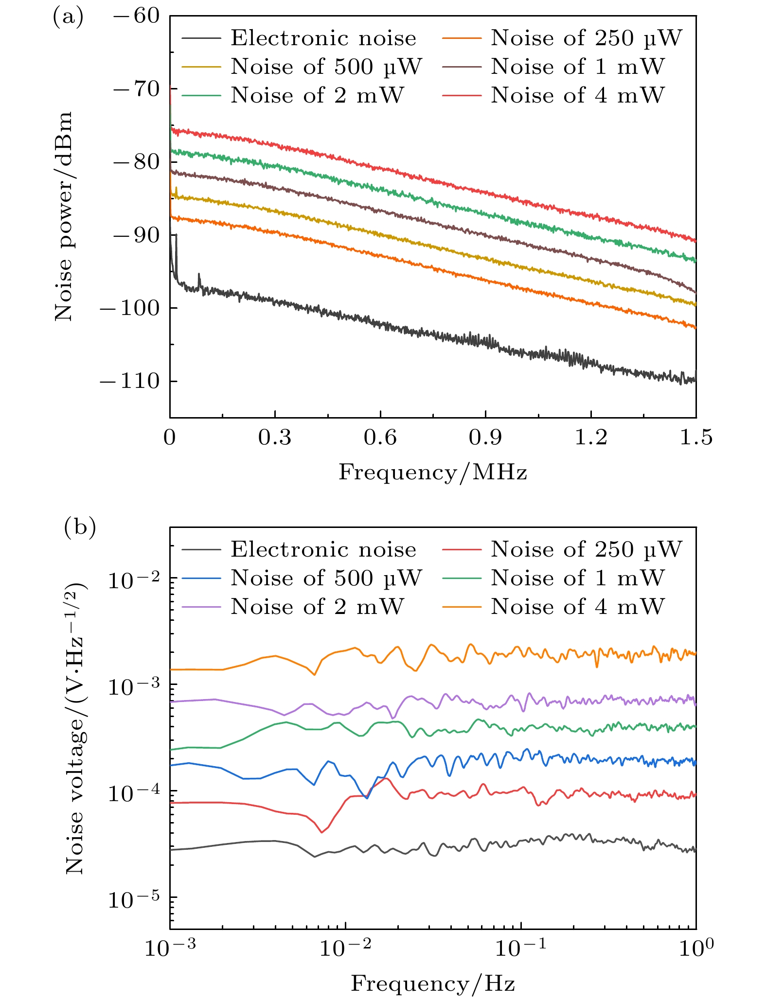 图 7  平衡光电探测器线性度测试噪声谱表征 (a) 1 kHz—1.5 MHz频段性能的测量结果; (b) 1 mHz—1 Hz频段性能的测量结果