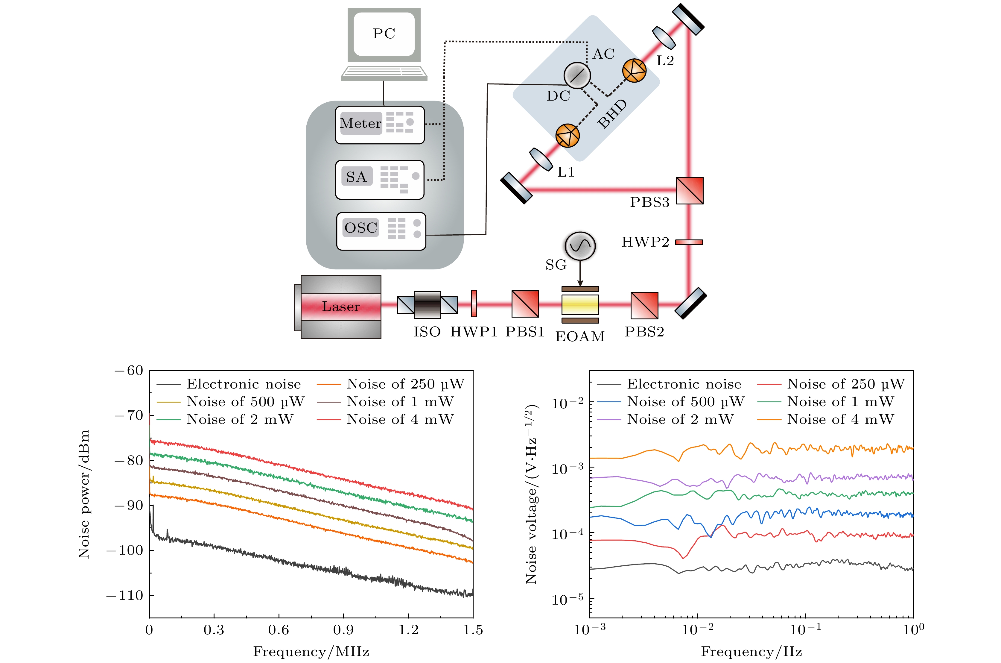 • 平衡光电探测器的性能测试装置如图5所示, 激光器采用国产Nd:YVO4单频激光器(1064 nm波长, 2 W最大功率), 其输出光束经过隔离器后再经过由HWP1与PBS1组成的偏振调节系统实现功率调节, 经PBS1后的输出光束通过电光幅度调制器(EOAM)和PBS2, 其中EOAM由信号发生器SG驱动, 实现光强振幅分量的精确调制. 在光功率平衡调节方面, 由HWP2与PBS3构成的可调分束系统实现了双路的光功率平衡, 其光束经过透镜后入射到平衡探测器的两个PD中. 该PD采用两个同型号的InGaAs (FD 300W)光电二极管作为光电转化模块, 确保良好的一致性. 平衡光电探测器采用交直流双路输出结构, 直流分量(DC)接入数字示波器(OSC)实时监测双PD光功率平衡度, 交流信号(AC)接入频谱分析仪(RS: FSW-8)进行噪声功率谱测量. 值得注意的是, 对于更低频段的测量, 目前低频商用谱仪无法对其进行精准评估测量, 因此需要对更低频段的噪声进行评估与表征. 在实验中, 使用高精度数字万用表(Keithley: 3706A)对电压进行时域采集, 再结合LPSD算法[40]对时域采集信号进行处理并获得噪声谱分析结果.