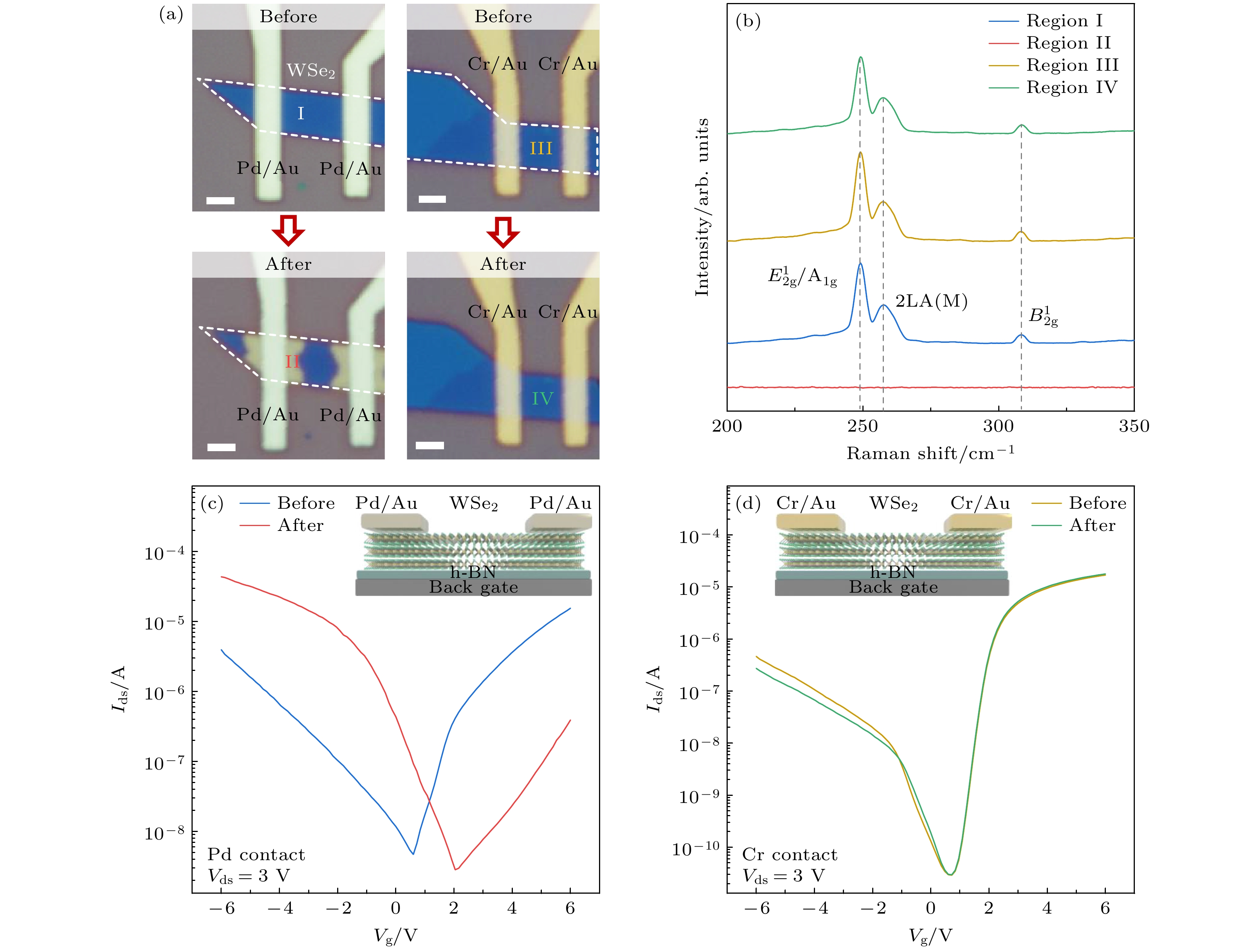 WSe2作为本征双极性半导体, 其场效应特性可通过外场调控实现电子与空穴导电态的动态切换, 为基于单一材料平台的互补逻辑器件的构建提供了物理基础[19,20,23,25,27–29]. 本研究首先探究了WSe2 FETs器件中由热退火诱导的接触界面重构伴随的场效应极性调控行为. 采用机械剥离的WSe2作为沟道材料, 利用电子束曝光和电子束蒸镀等微纳加工技术分别制备了以Pd和Cr作为接触电极的FETs器件. 图1(a)展示了器件在热退火处理(200 ℃, Ar气氛下30 min)前后的光学照片, 将Pd-WSe2 (Pd金属作为源漏接触电极)和Cr-WSe2 (Cr金属作为源漏接触电极)器件在退火前后的电极近邻沟道区域分别标记为区域Ⅰ, Ⅱ, Ⅲ和Ⅳ. Pd-WSe2器件中区域Ⅱ(退火后)相较于区域Ⅰ(退火前)发生了明显的光学衬度变化, 表明退火后Pd电极与WSe2沟道间形成了新的界面接触层, 即退火诱导了器件中Pd电极与WSe2沟道界面的重构. 图1(b)所示的拉曼光谱表征结果进一步验证了这一变化: 区域Ⅰ处的拉曼光谱中观察到位于249 cm–1, 257 cm–1, 309 cm–1的特征峰, 分别对应于WSe2的