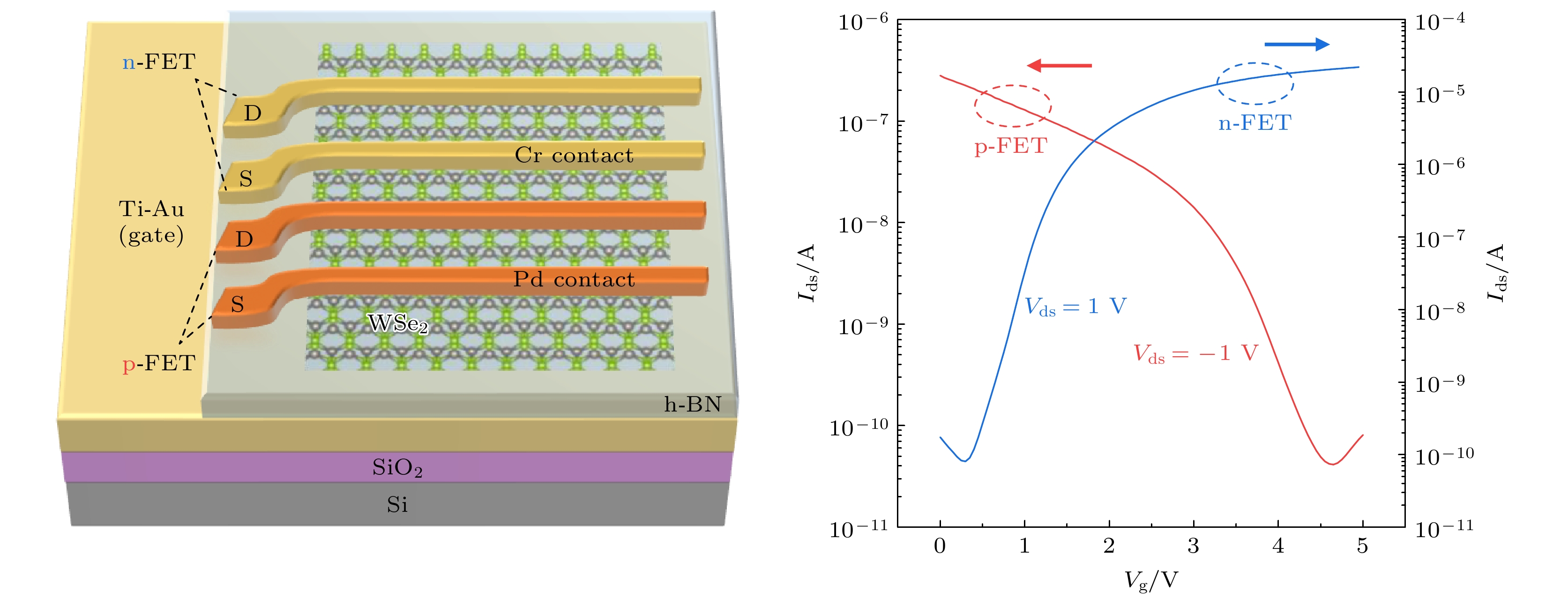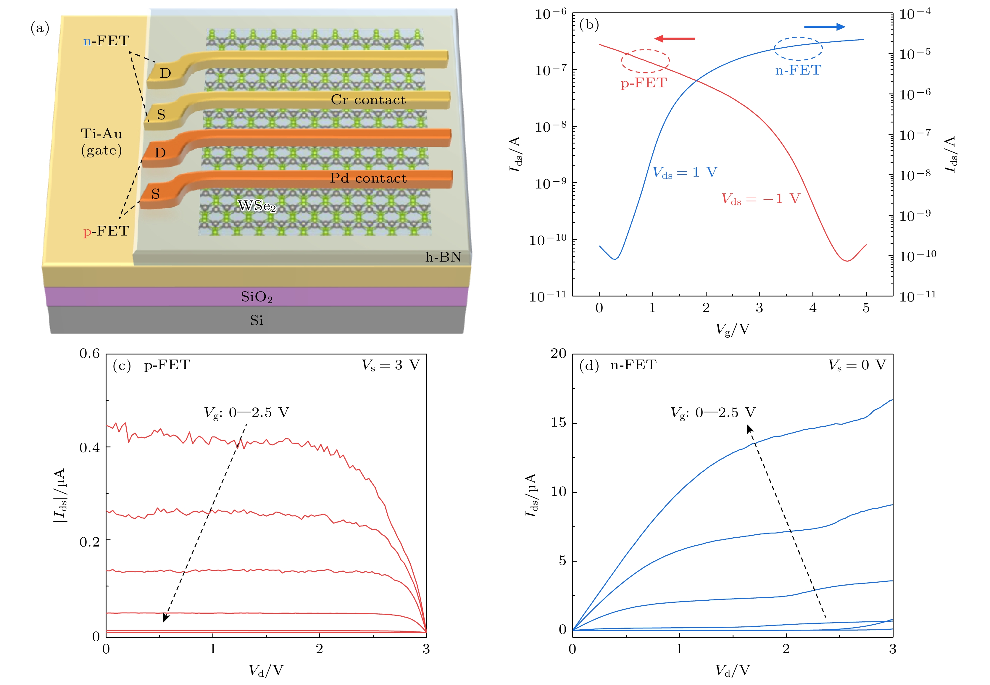 图 2 基于WSe2的互补FETs的单片集成与电学特性 (a) 在单一WSe2材料上集成互补FETs的器件结构示意图, 经退火操作后, Pd-WSe2 FET表现为p-FET, Cr-WSe2 FET表现为n-FET; (b) p-FET和n-FET的转移特性曲线, 其中红色曲线代表p-FET, 蓝色曲线代表n-FET, 施加的Vds分别为–1 V和1 V; p-FET(c)和n-FET(d)的输出特性曲线, Vg变化范围为0—2.5 V, 变化步长为0.5 V, 施加的Vs分别为3和0 V