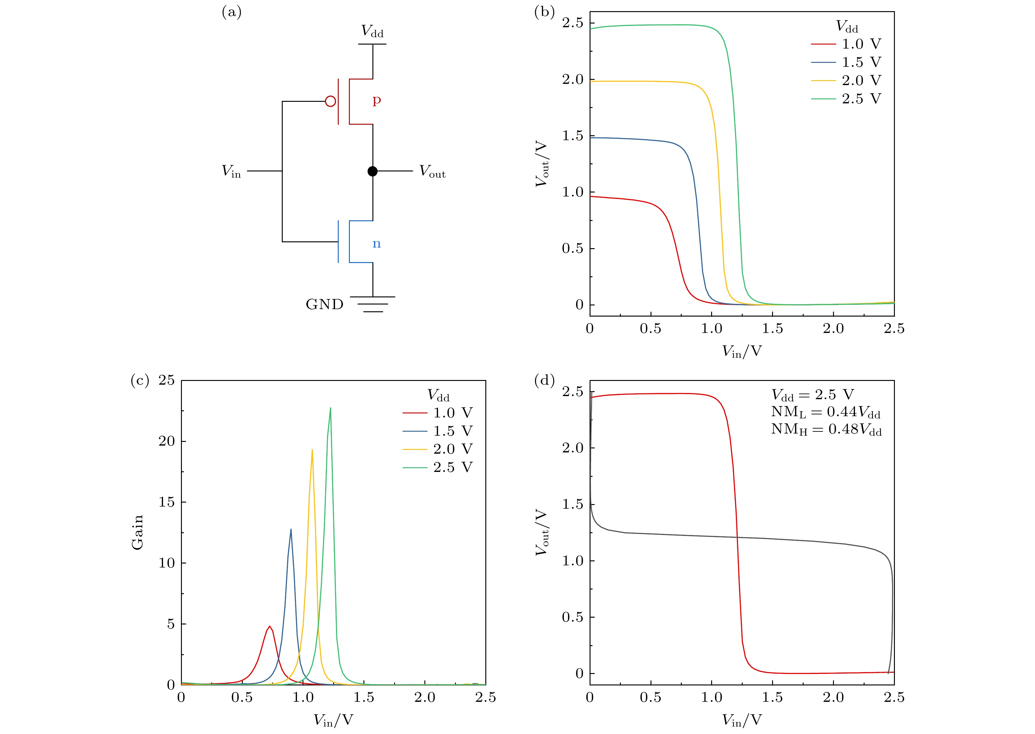 基于上述FETs极性调控策略, 本研究在单一WSe2材料上实现了互补FETs的单片集成. 所构筑的器件中采用机械剥离的WSe2作为沟道材料, h-BN作为栅介质, 并在同一WSe2沟道上制备Pd, Cr两种不同的金属作为源漏电极, 器件结构如图2(a)所示. 经一步退火处理, 形成了具有互补特性的p-FET(Pd-WSe2 FET)和n-FET(Cr-WSe2 FET). 为了验证互补FETs在逻辑电路中的工作性能, 在统一的电压范围内对p-FET与n-FET转移特性和输出特性进行了表征. 器件的转移特性曲线如图2(b)所示, 在0—5 V的Vg范围内, Cr-WSe2 FET在源极接地、漏极施加1 V电压 (Vds = 1 V)的条件下表现出n型场效应特性(蓝色曲线); 而Pd-WSe2 FET在源极施加5 V电压、漏极施加4 V电压(Vds = –1 V)的条件下表现出p型场效应特性(红色曲线). p-FET和n-FET的电流开关比分别超过103和105, 关态电流均小于10–10 A, 开态电流均大于10–7 A, 能够确保互补逻辑电路实现稳定的逻辑状态分离. p-FET和n-FET的输出特性曲线分别如图2(c)与图2(d)所示, 在相同的Vg (0—2.5 V)与Vd (0—3 V)范围内, 在p-FET源极施加3 V偏置电压, 在n-FET源极接地的电学操作下, 两器件均展现出典型的输出电流饱和特性, 这一特性是互补FETs实现高增益反相器电路性能的关键[23]. 综上所述, 基于一步退火法构筑的WSe2互补FETs所展现的优异电学特性为后续研究中逻辑反相器的构建奠定了重要基础.