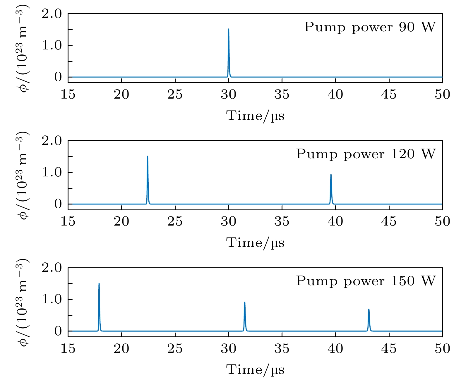 $ \phi $ 为光子数密度;$ {t_{\text{r}}} = {{2 l'} \mathord{\left/ {\vphantom {{2 l'} c}} \right. } c} $ 为光在光学长度为$l'$ 的谐振腔内往返一周的时间;$ \sigma $ ,$ N $ ,$ l $ ,$\tau $ 分别为激光介质的受激发射截面、反转粒子数密度、长度和上能级寿命;$ {N_{\text{g}}} $ ,$ {N_{\text{e}}} $ ,$ {N_{{\text{0s}}}} $ 分别为可饱和吸收体的基态粒子数密度、激发态粒子数密度和总粒子数密度;$ {\sigma _{{\text{gs}}}} $ 和$ {\sigma _{{\text{es}}}} $ 分别为可饱和吸收体的基态和激发态吸收截面;$ {\tau _{\text{g}}} $ 为可饱和吸收体的激发态粒子寿命;${l_{\text{s}}}$ 为可饱和吸收体的长度;$R$ 为输出镜反射率;$L$ 为腔内往返的随机损耗;${W_{\text{p}}}$ 为泵浦功率;$h$ 为普朗克常量;${V_{\text{p}}}$ 为泵浦光子频率;$r$ 为激光增益介质有效半径;$\gamma $ 是反转衰减因子;${T_0}$ 代表可饱和吸收体小信号透过率.通过HITRAN数据库, 可获得乙醇在2.79 μm处的吸收光谱参数, 将该库中的298 K温度下的吸收截面值作为其基态吸收截面. 被动调Q的机理是由于可饱和吸收体的激发态吸收截面要较基态吸收截面小得多, 以至于在强光泵浦处于饱和吸收时吸收系数快速变小成透明被漂白. 饱和吸收体的激发态与基态的吸收截面大小的差异因材料而异, 一般在1—3个数量级之间. 在无法获取到激发态吸收截面的数据情况下, 为方便仿真计算, 本文假设乙醇的激发态吸收截面为基态吸收截面的百分之一, 并将其代入被动调Q速率方程中进行分析. 利用Matlab进行仿真, 不同泵浦功率下光子数密度随时间变化特性如图1所示.