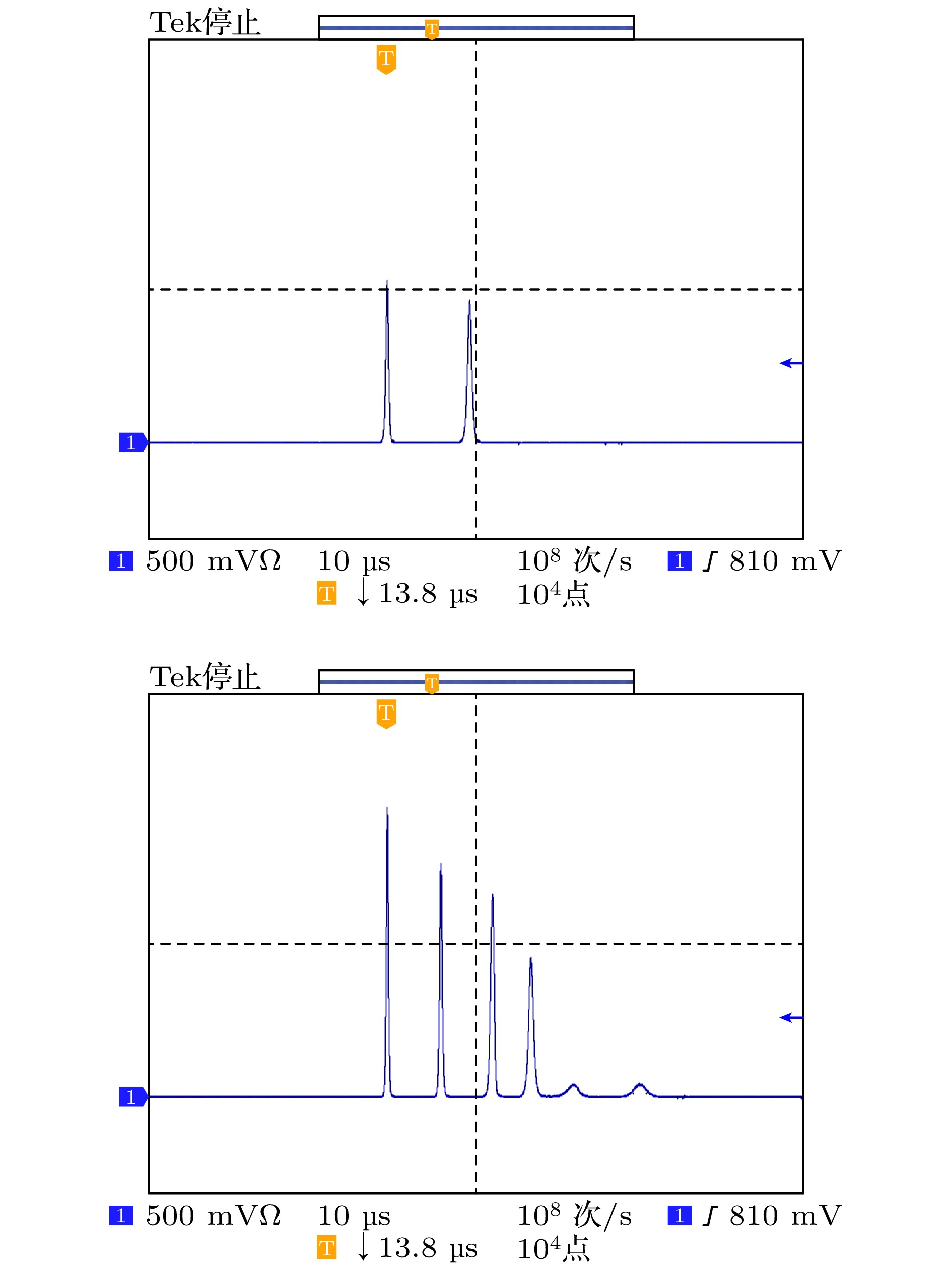 从仿真的激光脉冲振荡结果可以看出, 在高泵浦功率下会产生多个脉冲, 且脉冲间隔固定, 序列子脉冲能量逐步下降. 在相同泵浦脉宽下, 随着泵浦功率的增大, 子脉冲个数增加, 脉冲宽度减小, 脉冲序列间隔时间也逐渐缩短, 与实验结果基本一致. 同时, 将激发态吸收截面分别调整为基态吸收截面的1/10和1/1000, 仿真的结果依然呈现上述脉冲序列特性规律. 下一步, 需建立2.79 μm稳定的强激光快速检测系统, 以获取乙醇激发态吸收截面的实验值.