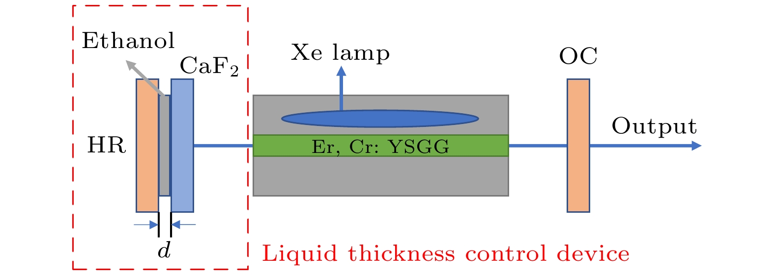 乙醇作为生活中常见的液体材料, 不仅易提纯制取、热扩散性好, 且具有卓越的分子和化学物理特性. Vodopyanov等[14]通过衰减全反射棱镜系统在2.94 μm Er:YAG固体激光器中实现了乙醇被动调Q输出, 在泵浦能量120 J, 重复频率为2 Hz下, 调Q脉冲宽度为130—140 ns, 脉冲能量为80—85 mJ, 实验中通过反射损耗测得等效乙醇溶液厚度为1.1 μm, 证实了乙醇溶液具有可饱和吸收特性, 但溶液厚度对饱和吸收的影响以及吸收暗区的影响还需要进一步研究.