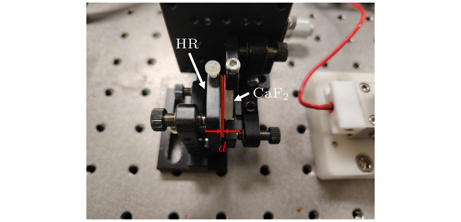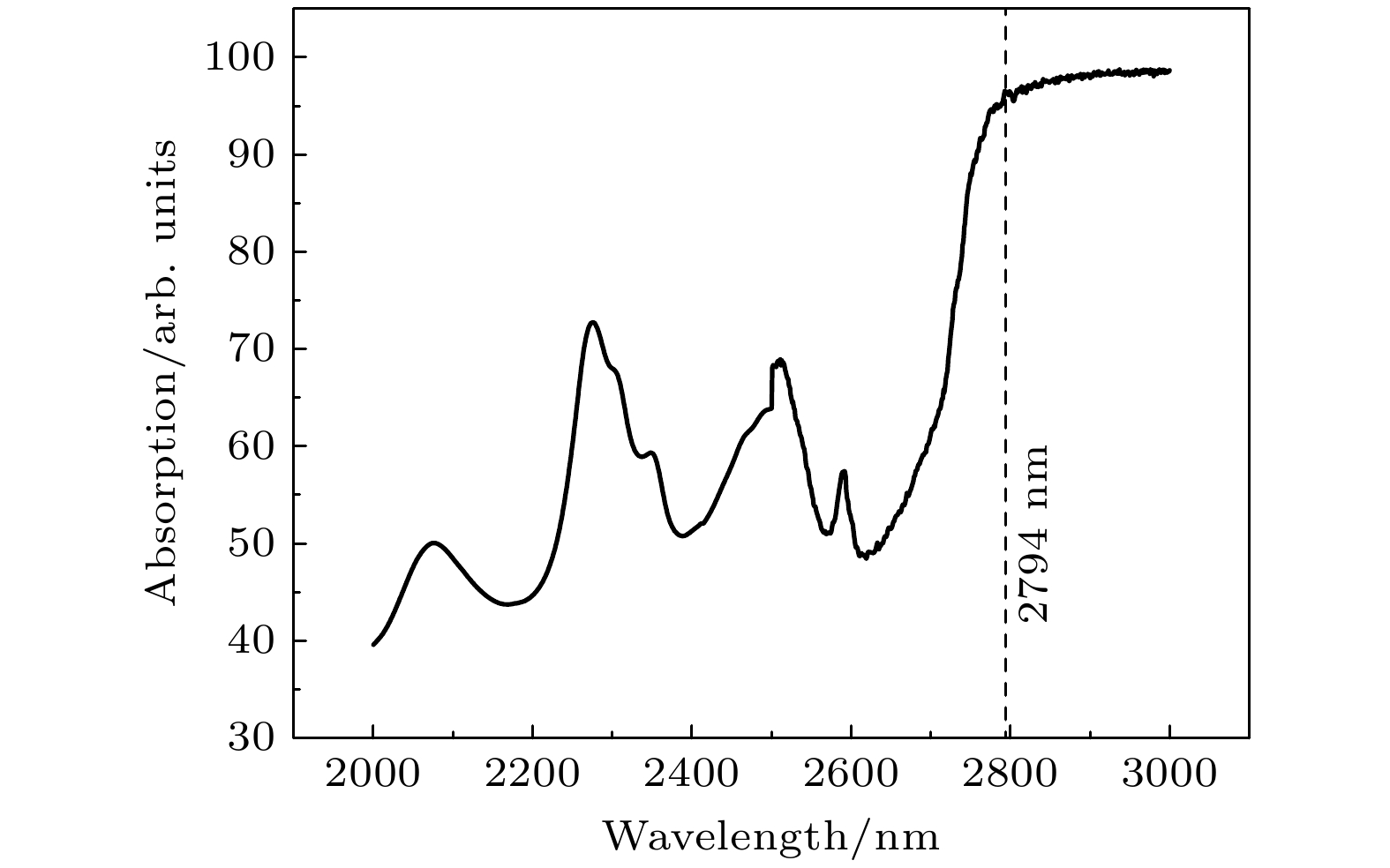 实验装置如图2所示, Er, Cr:YSGG晶体棒的尺寸为Ф3 mm × 70 mm, Cr3+的原子百分比为3%, Er3+的原子百分比为30%, 晶体棒两端镀有2.79 μm增透膜. 谐振腔为平平腔结构, 几何腔长为248 mm. HR为全反镜, 在2.79 μm波长的反射率大于99%, 耦合输出镜OC在2.79 μm处的内腔面反射率为70%, OC外腔面镀增透膜. 液体厚度调控装置实物图如图3所示, 可饱和吸收溶液夹在一块未镀膜的CaF2镜片和全反镜之间, 溶液的厚度用d表示, 其中CaF2镜片通过三维位移台进行水平移动, 从而改变可饱和吸收溶液的厚度. 因为溶液厚度在微米量级, 为了更准确地测量溶液的厚度, 我们采用显微镜观测, 螺旋测微仪和三维位移台来综合进行测量. 本研究选用浓度为99.5%的乙醇作为饱和吸收溶液. 为了验证乙醇在2.79 μm波段的强吸收特性, 使用PE Lambda-950 UV/VIS/NIR分光光度计, 对厚度为5 μm的乙醇溶液进行吸收光谱测量. 测量结果显示, 在2.79 μm波段附近, 乙醇溶液表现出显著的吸收特性, 具体吸收光谱如图4所示. 激光器采用氙灯泵浦, 放电脉冲宽度为250 μs, 脉冲重复频率为20 Hz, 为保证激光器安全稳定工作, 采用去离子水对其进行冷却, 水温为(293.0 ± 0.1) K, 流量为20 L/min. 在实验中, 先实现静态脉冲输出, 再通过注射器向结构内注入乙醇, 然后缓慢减小厚度d直到调Q脉冲输出为止.