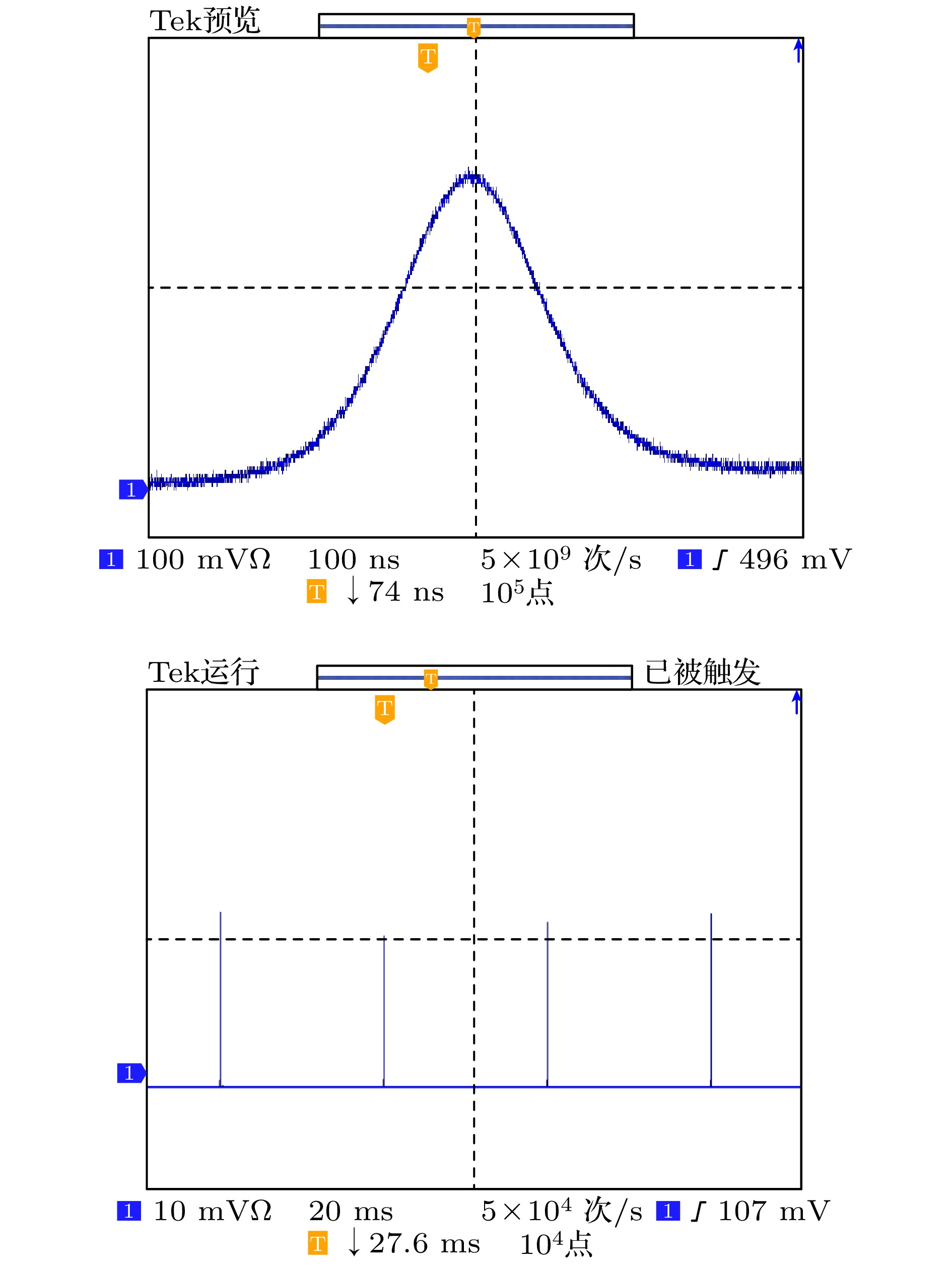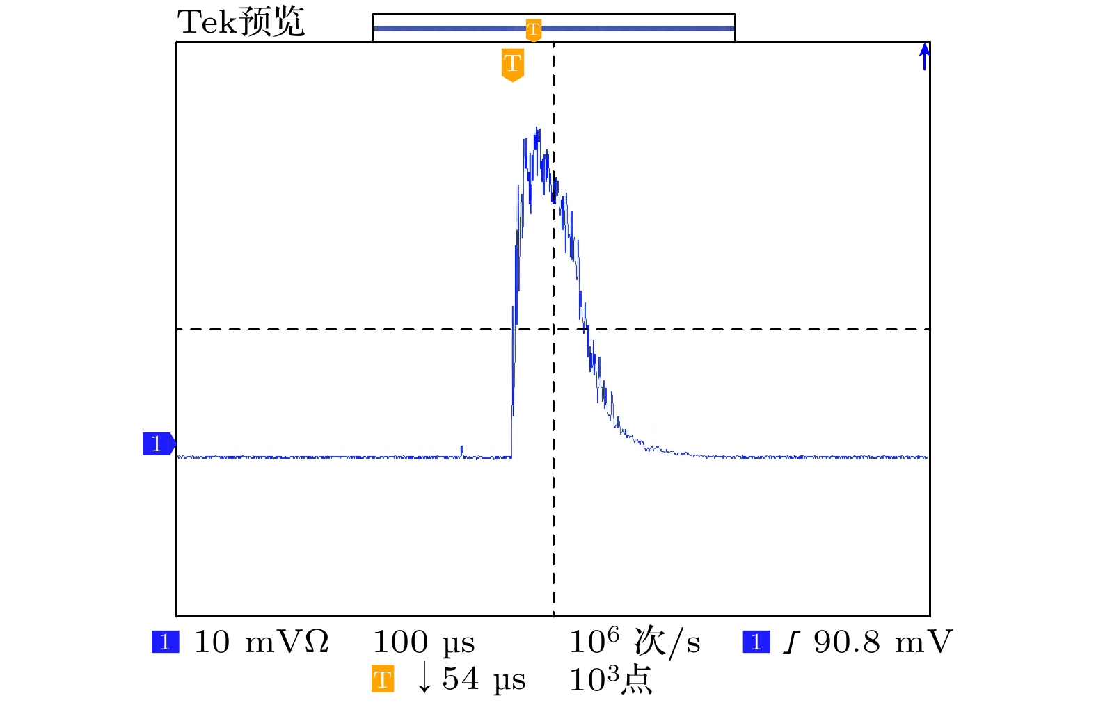 为了更直观地对比调Q脉冲与静态输出的差异, 首先在相同的实验结构下, 移除了乙醇溶液, 仅将激光器的重复频率设置为20 Hz, 并固定泵浦能量在12.86 J, 进行静态输出实验, 其波形如图5所示.