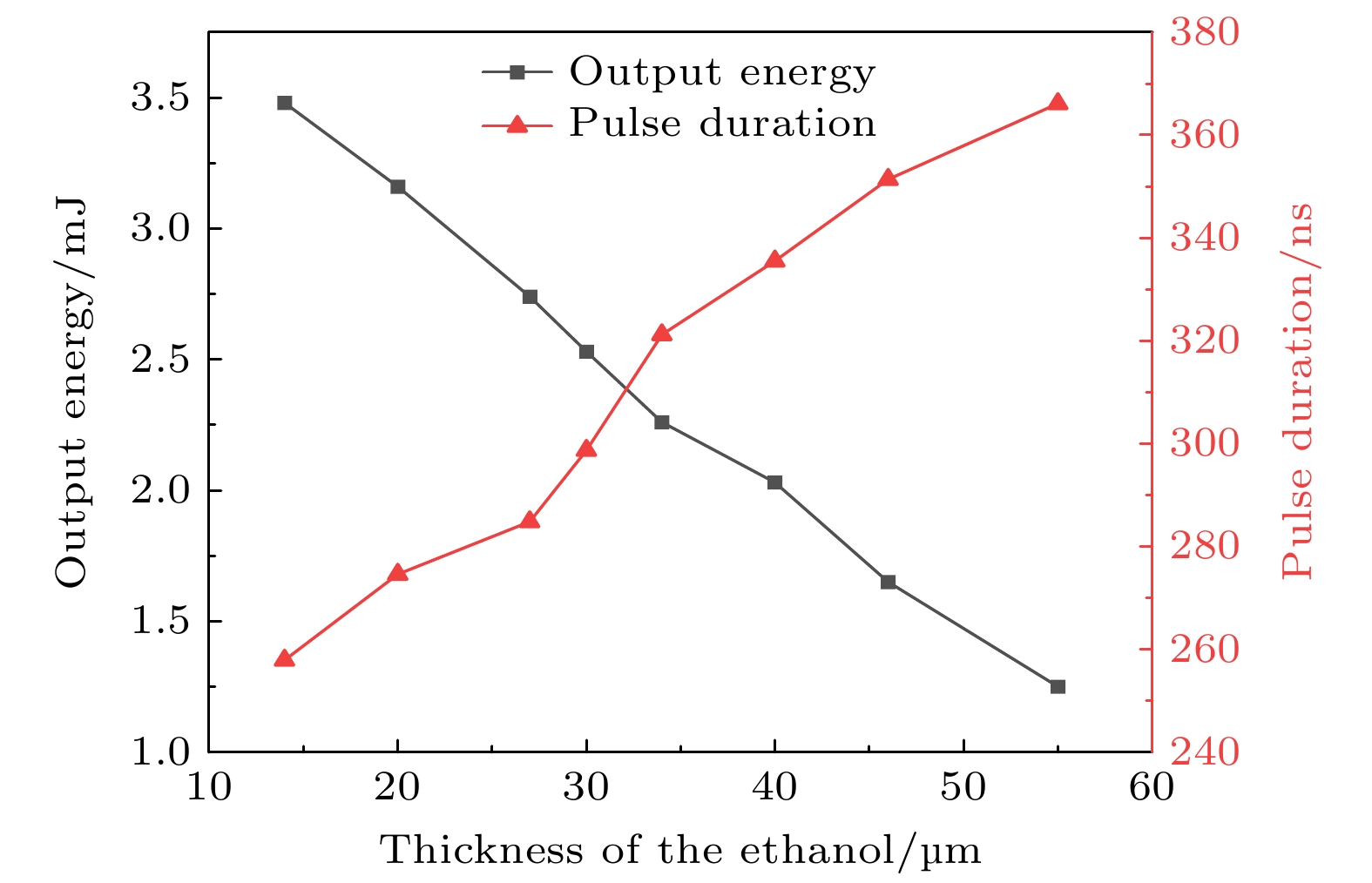 随后, 为了探究不同乙醇溶液厚度对调Q脉冲输出的影响, 我们重新引入乙醇溶液, 并对不同厚度下的调Q输出结果进行对比. 实验中, 保持激光器的重复频率为20 Hz, 泵浦能量固定在12.86 J, 逐步增大乙醇溶液的厚度, 从14 μm到55 μm, 测量其脉冲输出, 结果如图6所示, 图中所标注的脉冲宽度为主脉冲的宽度. 结果表明, 在相同泵浦条件下, 随着乙醇厚度的增大, 脉冲宽度逐渐变大, 脉冲能量逐渐降低. 具体来说, 当乙醇厚度为14 μm时, 脉冲宽度为257.9 ns, 脉冲能量为3.48 mJ; 而当乙醇厚度增至55 μm时, 脉冲宽度变宽至366.1 ns, 脉冲能量降低到1.25 mJ. 该现象主要归因于较薄的乙醇层能够更快地达到饱和吸收状态, 减小腔内损耗, 促进激光脉冲的快速形成和输出. 同时, 较薄的乙醇层在热效应和腔内损耗的动态变化方面也表现出更优的特性, 进一步促进了脉冲宽度的变窄.