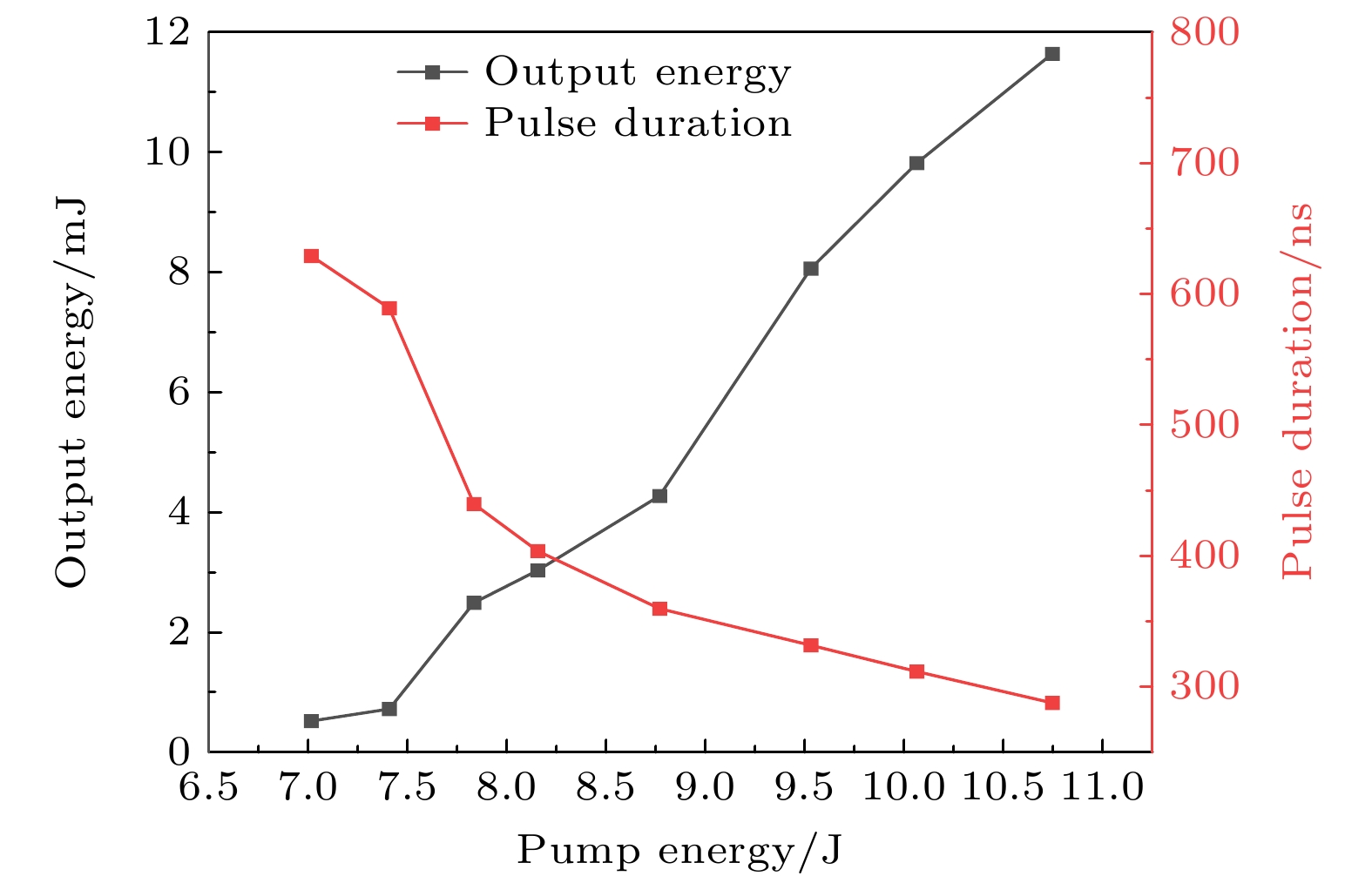 为了更稳定测量后续数据, 实验固定乙醇溶液厚度为45 μm, 泵浦能量从7.01 J增至10.75 J, 其脉冲宽度和脉冲能量随泵浦能量的变化见图8. 可以看出, 输出脉冲能量从0.52 mJ增至11.64 mJ, 同时主脉冲宽度从629.1 ns减小到287.6 ns, 脉冲宽度随着泵浦能量的增大不断减小, 这是调Q脉冲的典型特征. 通过ABCD矩阵计算了乙醇溶液上光束直径为2.707 mm, 实验过程中乙醇溶液没有出现击穿或损伤, 且输出能量没有饱和, 还有进一步增大的可能, 但在该验证实验中未继续增大泵浦能量. 在与图6厚度变化实验的结果对比时会发现, 相同乙醇厚度下, 泵浦能量更小的时候, 输出能量反而更大. 这与溶液固定容器有关, 当不断改变厚度的情况下, CaF2镜片会不可避免地产生微小的倾斜, 这会极大程度地影响激光输出, 在测量厚度变化曲线时, 只能控制整体趋势的准确性, 无法细调每个厚度的最佳状态.