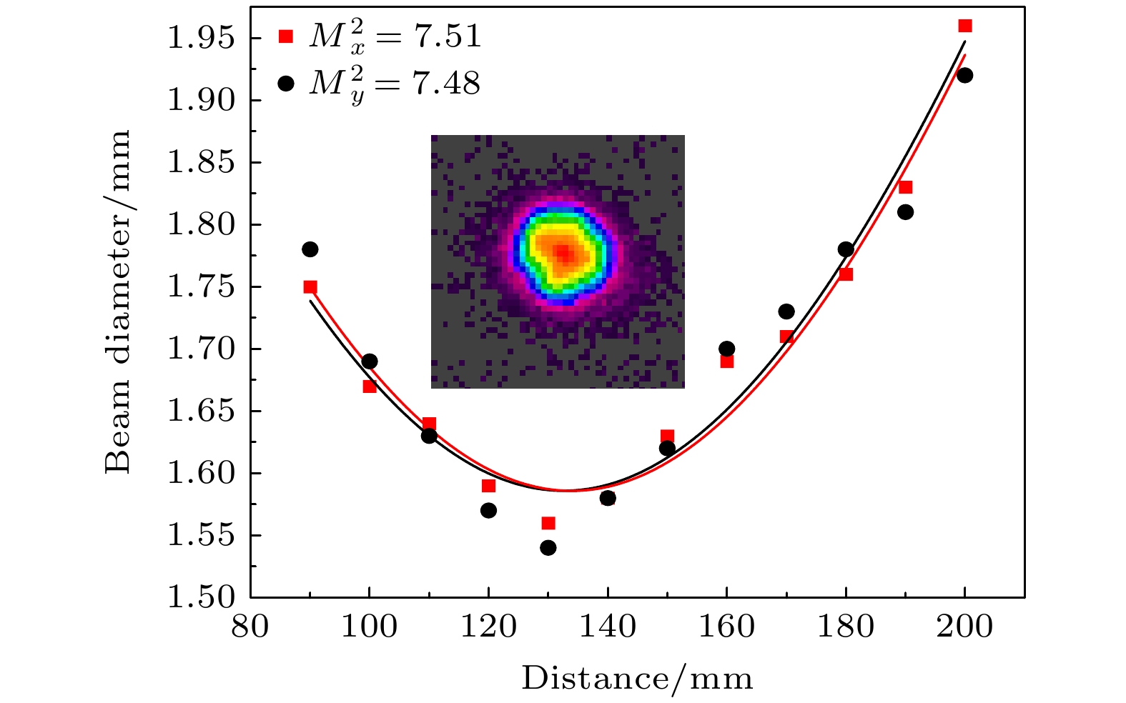 当乙醇厚度为45 μm、泵浦能量为10.75 J、重复频率为20 Hz时, 通过Pyrocam Ⅲ MIR-C-B光束轮廓分析相机测得聚焦后不同位置的光束尺寸, 计算出两个方向上的光束质量因子分别为