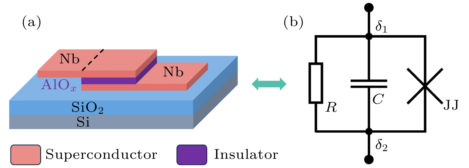 Figure 1.  Schematic diagram of a Josephson junction: (a) Schematic diagram of a typical sandwich structure of a Nb/Al-AlOx/Nb Josephson junction; (b) Josephson junction RCSJ circuit model diagram.