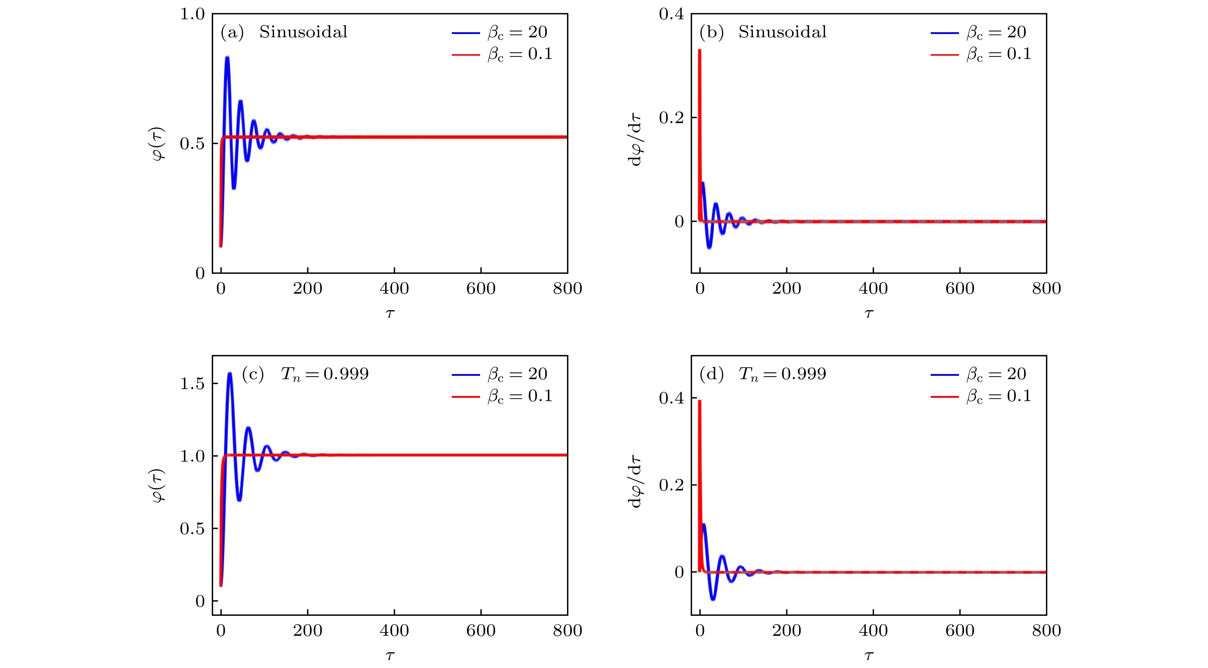 • 首先对(7)式进行数值计算, 观察欠阻尼和过阻尼约瑟夫森相位随时间的变化规律, 从而能够帮助理解两种类型约瑟夫森结的动力学特征. 图2(a)图2(b)所示为正弦CPR约瑟夫森结在欠阻尼($ \beta_{\mathrm{c}} = 20 > 1 $)和过阻尼($ \beta_{\rm{c}} = 0.1 < 1 $)时约瑟夫森相位和相位导数的动力学行为. 本文中如果没有特别说明, 欠阻尼结$ \beta_{\rm{c}} = 20 $, 过阻尼结$ \beta_{\rm{c}} = 0.1 $. 可见过阻尼结相位(图中红色曲线)很快达到稳态, 而欠阻尼结经过振荡后逐渐达到稳态. 这是符合我们对两种约瑟夫森结的物理直觉的, 欠阻尼结I -V曲线的突然跳变现象就是来源于相位建立稳态需要更久的时间. 进一步地, 为了研究非正弦CPR约瑟夫森结相位的动力学行为, 使用(18)式对本文中非正弦CPR电流-电压关系进行描述. 这里的CPR关系是根据参考文献[22]中的结果进一步归一化后得到的, 此处归一化的目的是和正弦型CPR约瑟夫森结计算结果进行对比, $ T_n $越大, CPR越倾斜, 即透射率越高, 如图3(a)所示. 从图2(c)图2(d)可以看到, $ T_n $ = 0.999时约瑟夫森结的相位行为和正弦CPR约瑟夫森结类似, 不同的是在幅值上会有差别, 这可能会带来约瑟夫森结的I -V关系和电感效应等特性的不同. 下面进一步计算并观察非正弦CPR约瑟夫森结动力学特点.