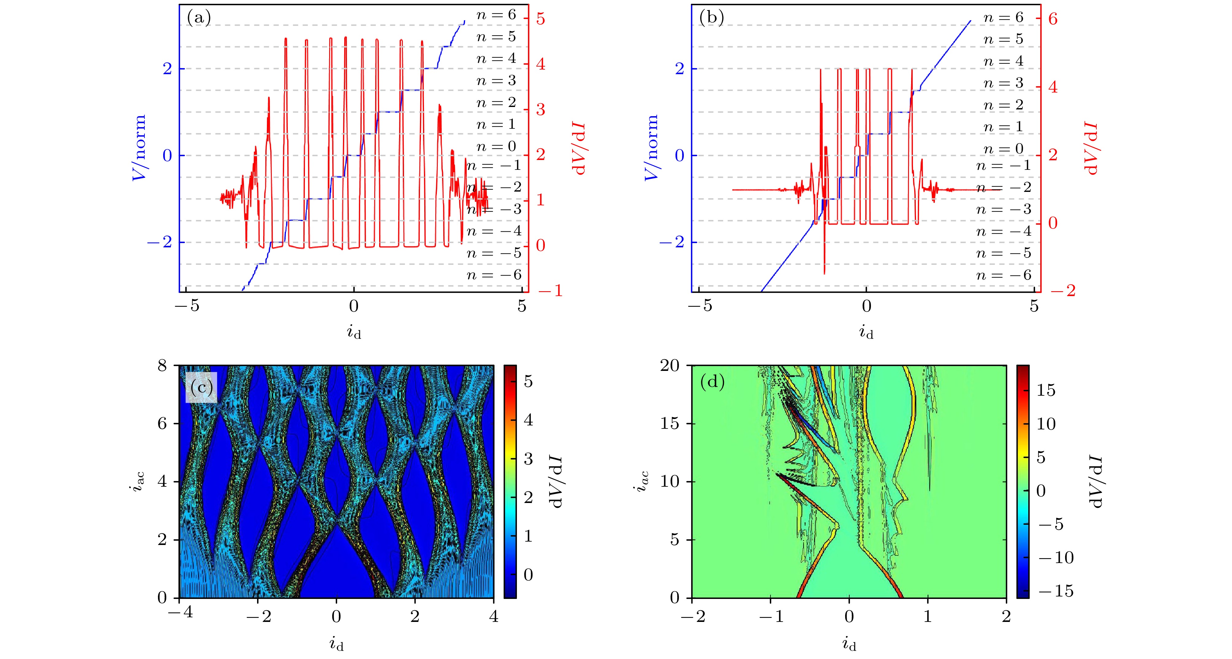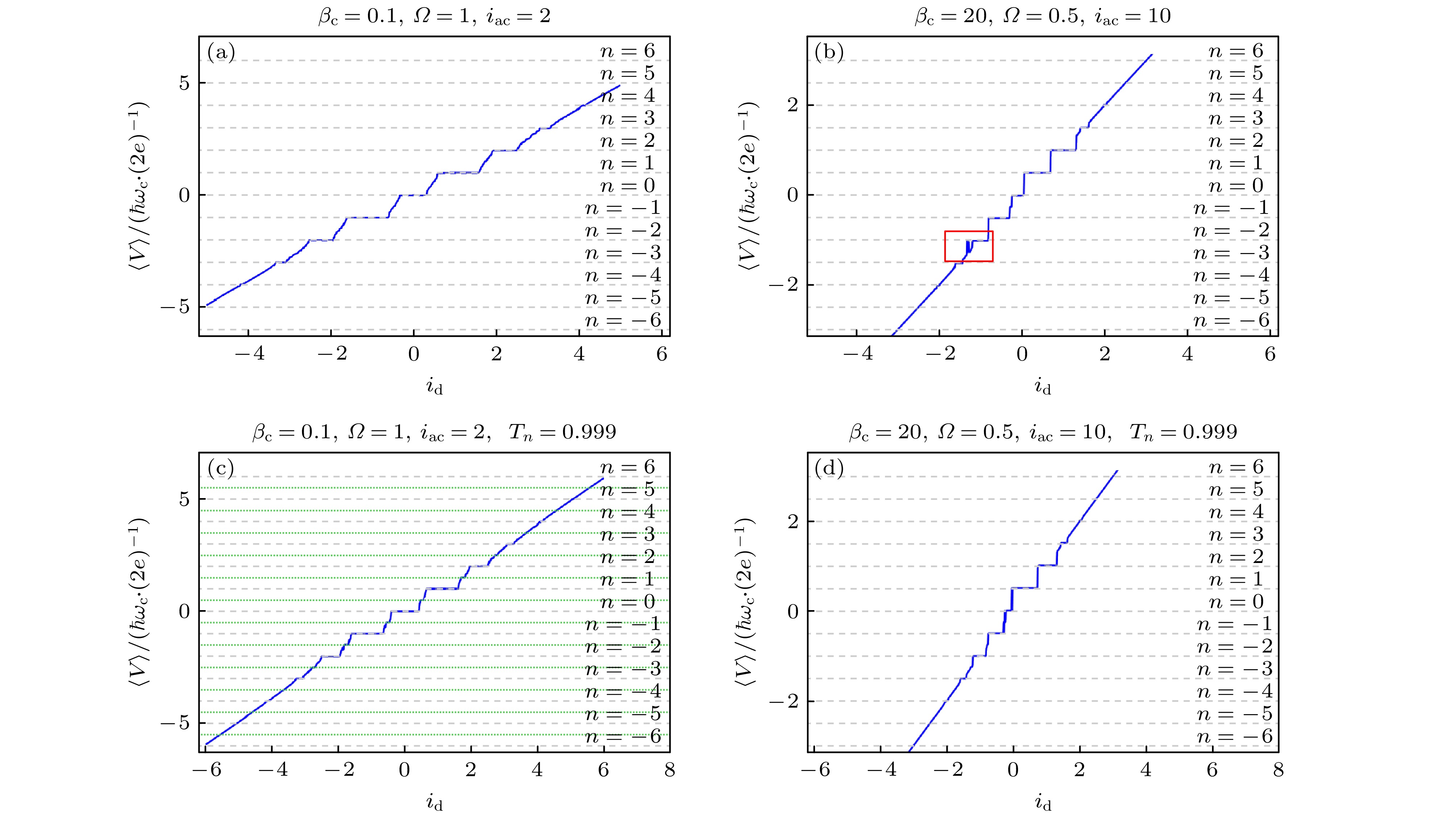 图4(a)图4(b)给出了n从–6到6对应的台阶并用灰色虚线表示台阶位置, 这和我们基于RCSJ方程计算的夏皮洛台阶位置符合, 说明本文数值计算的过程是合理的. 对于欠阻尼结在实际计算中发现其建立夏皮洛台阶是很困难的, 具体是需要很大的微波幅值, 如图4(b)中的欠阻尼结的夏皮洛台阶$ i_{\mathrm{ac}} = 10 $, 说明需要使用远大于约瑟夫森结临界电流的微波信号才能激励欠阻尼结的夏皮洛台阶, 并且台阶中会有一些不稳定的波形存在, 如图4(b)中红色小方块部分. 计算中发现稍微改动一下参数如$ i_{\mathrm{ac}} $的大小, 都会对欠阻尼结的夏皮洛台阶带来很大影响. 这表明若想在实验上观察夏皮洛台阶, 需要制备过阻尼约瑟夫森结. 更进一步, 计算了非正弦CPR约瑟夫森结的夏皮洛台阶. 对应的$ T_n $ = 0.999, 如图4(c)所示. 可以很清晰地观察到半整数夏皮洛台阶, 图中绿色虚线标注了理论半整数夏皮洛台阶的位置, 可以看到n在–3到3之间的基于RCSJ模型计算的半整数夏皮洛台阶和绿色虚线台阶位置基本符合, 说明了数值计算是合理的. 这里基于RCSJ模型计算得出非正弦CPR会带来约瑟夫森结半整数夏皮洛台阶. 从理论上解释了约瑟夫森结出现半整数夏皮洛台阶的原因. 通过改变约瑟夫森结参数, 预计可以得到三分之一整数等更多分数台阶[14]. 图4(d)是非正弦CPR约瑟夫森结欠阻尼下的夏皮洛台阶, 并没有观察到半整数夏皮洛台阶的出现, 这再次表明半整数等分数夏皮洛台阶需要在过阻尼结中才能被清晰地观察到.