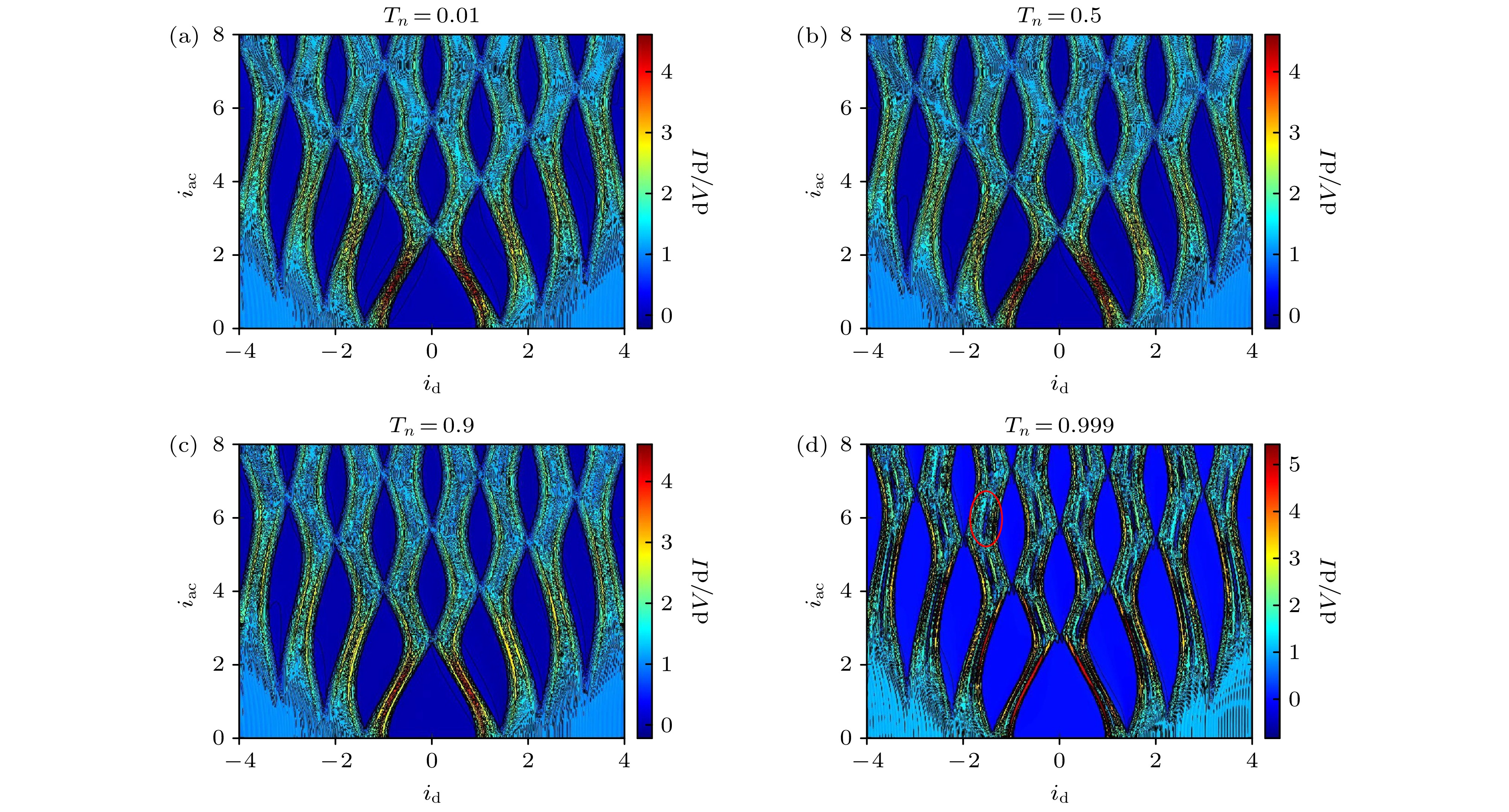 为了进一步研究约瑟夫森结夏皮洛台阶的规律, 计算了结相应的微分电阻, 如图5(a)图5(b)所示. 微分电阻很清晰地显示了具有夏皮洛台阶的位置, 即电阻瞬时降为零的位置. 这里数值计算的夏皮洛台阶对应的参数是$ \varOmega = 0.5 $, $ i_{\mathrm{ac}} = 2 $, 欠阻尼结的参数同上. 图5(c)图5(d)是通过参数扫描的方法绘制的微分电阻和施加的微波信号幅值$ i_{\mathrm{ac}} $以及直流偏置电流的关系, 这种网状结构的微分电阻, 更加充分地显示了夏皮洛台阶和施加在结上的信号的关系. 然而当采用相同的方法去观察欠阻尼结的微分电阻时, 如图5(d)所示, 并没有出现规律性的夏皮洛台阶, 欠阻尼结的夏皮洛台阶展示了一种混沌状态. 关于这种动力学行为的研究, 需要进一步的计算, 这超出了本文的研究范围. 对于非正弦CPR约瑟夫森结的微分电阻计算, 如图6所示, 分别展示了$ T_n $ = 0.01, 0.5, 0.9和0.999时过阻尼结下的微分电阻随着$ i_{\mathrm{ac}} $$ i_{\mathrm{d}} $的变化. 可以看到在$ T_n $ = 0.01时, 夏皮洛台阶变化规律和正弦CPR约瑟夫森结几乎相同; 随着透射率增加即$ T_n $增大, 在$ T_n $ = 0.999的夏皮洛台阶图中观察到明显的分数夏皮洛台阶, 图6(d)中红色椭圆显示了微小的零微分电阻的状态, 对应的就是分数夏皮洛台阶. 这里非正弦CPR约瑟夫森结在过阻尼状态下微分电阻同样表现出网状结构. 这和一些实验上观察到的结果类似[37,42,45], 说明了我们计算结果是合理的.