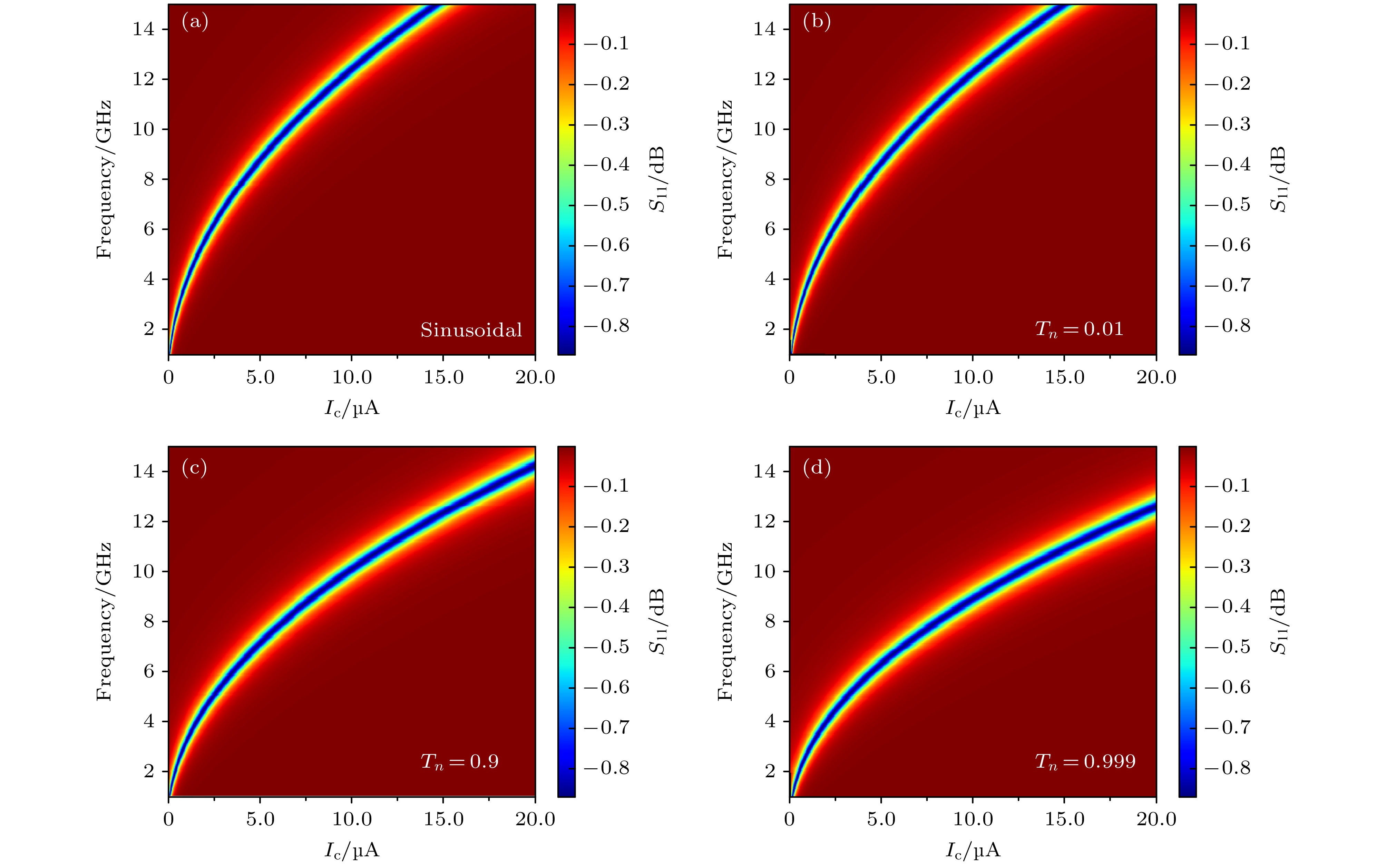 Figure 7.  Pseudocolor three-dimensional maps of the $S_{11}$ parameter versus frequency and junction critical current for ADS-simulated Josephson-junction nonlinear resonators: (a) Sinusoidal CPR; (b) $T_{n} = 0.01$; (c) $T_{n} = 0.9$; (d) $T_{n} = 0.999$