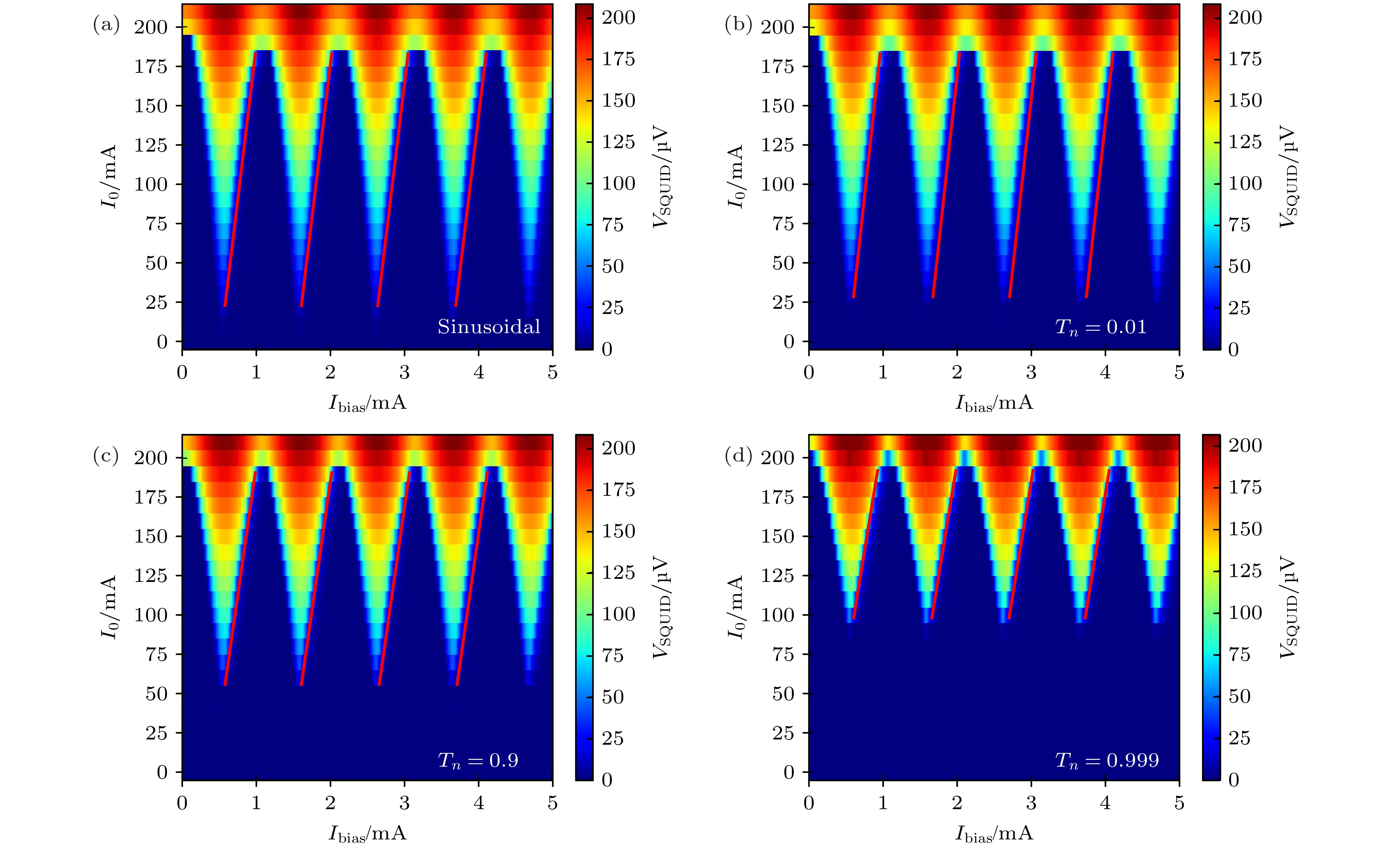 最后在ADS中构建了DC-SQUID模型, 这里的DC-SQUID模型构建是根据RCSJ模型完成的. 需要强调的是, 此处设置的约瑟夫森结的临界电流是$ 100\;\text{μA} $. 仿真构建的是一个过阻尼结, 因此在RCSJ模型基础上, 我们并联了一个小电阻, 电阻值为$ 2 \;\Omega $. 约瑟夫森结寄生电容$ C_{\mathrm{J}} = 1\, \text{pF} $, 非线性电阻采用(19)式建模. 更加具体的电路实现请参考补充材料图S3—图S5 (online). 需要特别指出, 这里的DC-SQUID模型是一个估算, 尤其是对于约瑟夫森结寄生参数以及电路互感和自感大小的估算. 控制这些变量相同, 从而研究不同CPR对外界偏置磁通对DC-SQUID电压的调制. 外界偏置磁通大小采用电流大小的方法表达, 两者可以通过互感这个中间物理量进行转换. 通过瞬态分析观察DC-SQUID的电压和外界偏置电流以及DC-SQUID的偏置电流$ I_0 $的关系, 如图8所示. 可见CPR越倾斜, 即$ T_n $越大, 外界偏置电流即外界偏置磁通对DC-SQUID电压的调制深度具有明显不同. 该结果和文献[49]结果具有相同趋势, 说明我们的模型可以用来定性描述不同CPR对DC-SQUID电压和外界偏置磁通的影响.