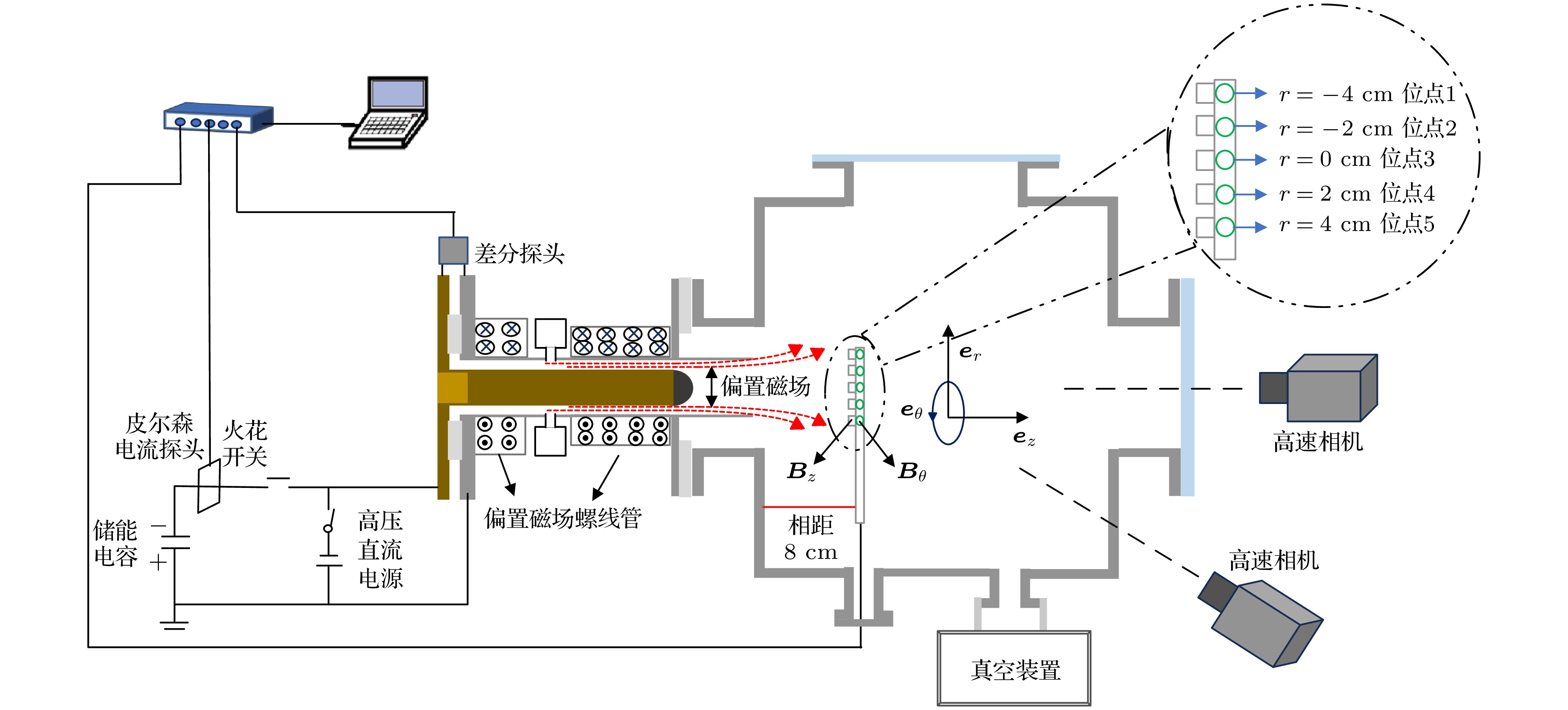 • 为便于描述磁化同轴枪喷射等离子体的运动特性, 本文选用柱坐标系$\left( {r, z, \theta } \right)$, 并以内电极头部中心作为坐标原点. 主要诊断手段包括二维磁探针与高速相机系统. 二维磁探针系统[24]由线圈与积分回路组成, 共设置5个测量位点, 位点间距为2 cm, 依次编号为1—5. 其中, 第3位点对准内电极中心位置, 整个探针布置在距离外电极枪口8 cm处(见图1). 每个测量位点均配置两个正交线圈, 分别用于测量轴向磁场${{\boldsymbol{B}}_z}$和环向磁场${{\boldsymbol{B}}_\theta }$. 为记录等离子体的空间演化过程, 实验采用两台不同型号的高速相机同步拍摄(Phantom VEO410L, Phantom T3610). 此外, 放电回路电流通过皮尔森电流探头(Pearson 101)进行测量; 内外电极两端的电压则由高压差分探头(PINTECH N1140A)获取. 所有诊断信号均由两台八通道数字示波器(PicoScope 4824)采集与记录, 其中采集零时刻为火花开关触发时刻, 确保实验数据的完整性、精确性与同步性.