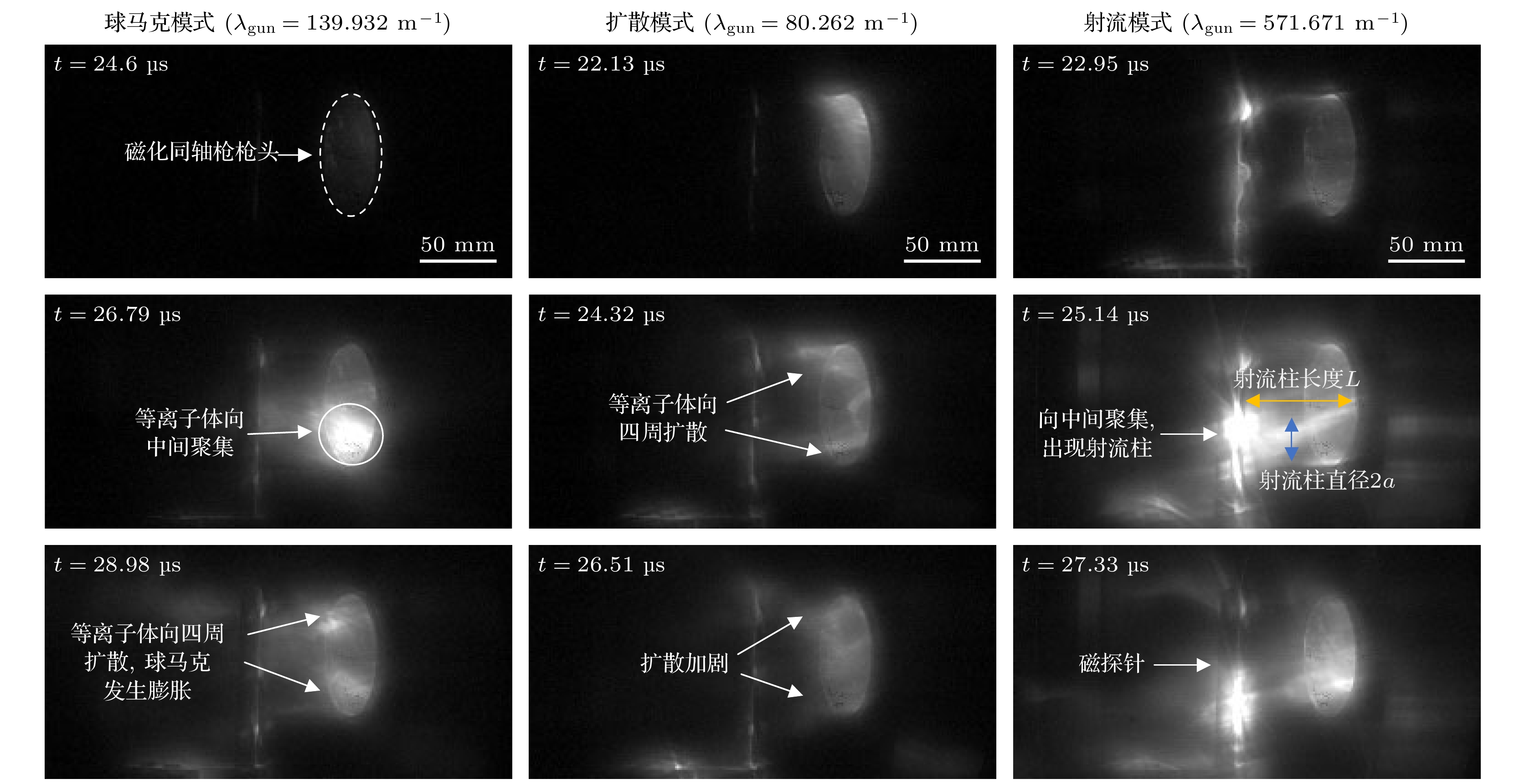 • 利用延时控制系统, 先后触发偏置磁场、脉冲注气以及火花开关, 以保证顺利击穿工质气体并形成等离子体, 当放电回路建立时, 电流和电压瞬间分别达到kA和kV量级, 因此可以认为等离子体达到强电离状态, 形成理想等离子体状态[16]. 内电极产生的环向磁场和偏置磁场都会被冻结在等离子体中. 等离子体向枪口运动, 磁压大于偏置磁场的磁张力, 拉伸偏置磁场, 最终会脱离枪口, 同时由于等离子体自身表现出阻性特征, 因此会发生磁重联, 导致其中的磁能转化为内能. 根据放电工况(放电电流峰值${I_{{\text{gun}}}}$与偏置磁通$\varPsi $的比值, ${\lambda _{{\text{gun}}}} = {{I_{{\text{gun}}}}}/{\varPsi }$, 简称流通比)的不同, 再结合对等离子体喷射过程的时空分辨(见图3), 最终将其演化过程划分为3种模式, 其中, 当${\lambda _{{\text{gun}}}}$较大时, 等离子体易于突破偏置磁场束缚, 在内电极前方形成柱状射流结构, 且随着时间演化射流出现上下摆动, 因此称为射流模式; 当流通比${\lambda _{{\text{gun}}}}$较小时, 等离子体喷出后迅速扩散, 整体呈现弥散分布, 发光时间短, 寿命较短, 因此称为扩散模式; 当流通比${\lambda _{{\text{gun}}}}$在两者之间时, 等离子体在枪口形成亮团并缓慢扩展, 呈现“甜甜圈”状, 称为球马克模式.