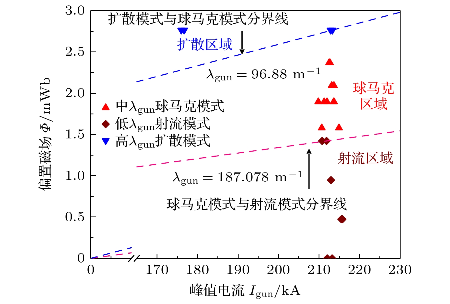 为准确划分3种模式, 通过大量实验数据及高速相机成像分析, 发现${{\varPsi }}$2.76 mWb时, 等离子体空间演化将会呈现明显的扩散模式特征, 当1.42 mWb $ < \varPsi < $2.76 mWb时, 呈现球马克模式下的空间演化特征, 当${{\varPsi }}$1.42 mWb呈现射流模式下的空间演化特征, 实验数据点通过不同形状的符号区分3种模式, 拟合虚线作为划分边界, 确定了基于流通比${\lambda _{{\text{gun}}}}$的模式划分标准, 如图4所示.
