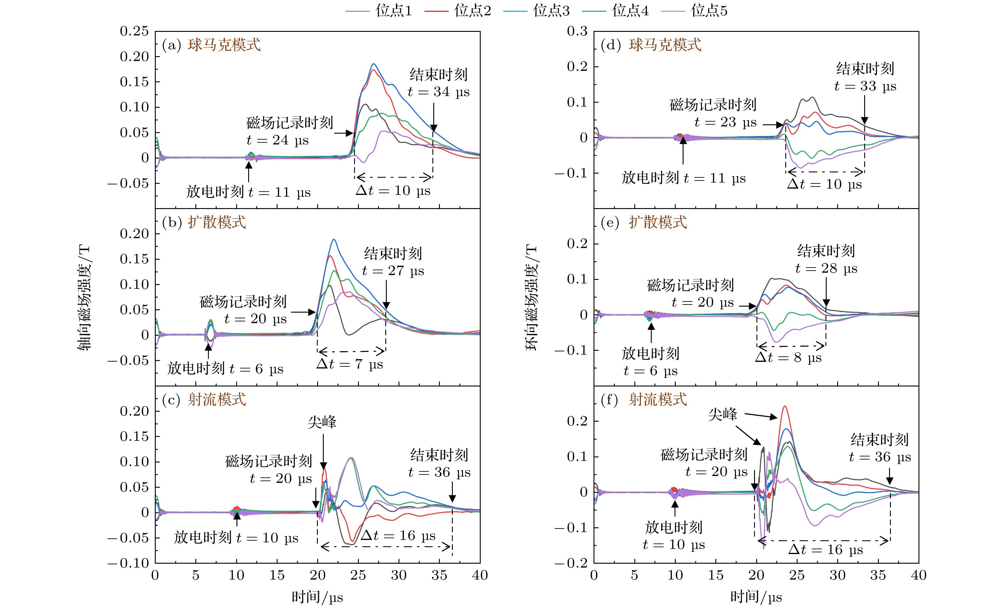 图 5  不同模式下磁场信号波形 (a), (b) 球马克模式; (c), (d) 扩散模式; (e), (f) 射流模式