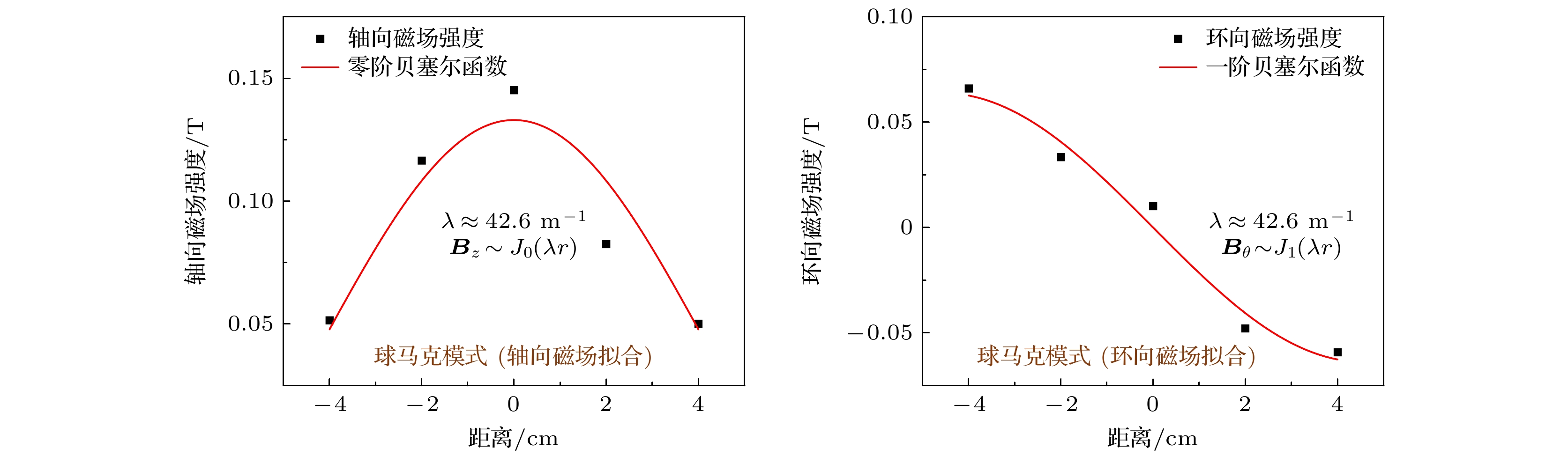 球马克模式 ${{\boldsymbol{B}}_z}$中间大, 两边小, ${{\boldsymbol{B}}_\theta }$中间小, 两边大, 方向相反, 能够与贝塞尔函数拟合$\lambda \approx 42.6\;{{\text{m}}^{ - 1}}$ 10