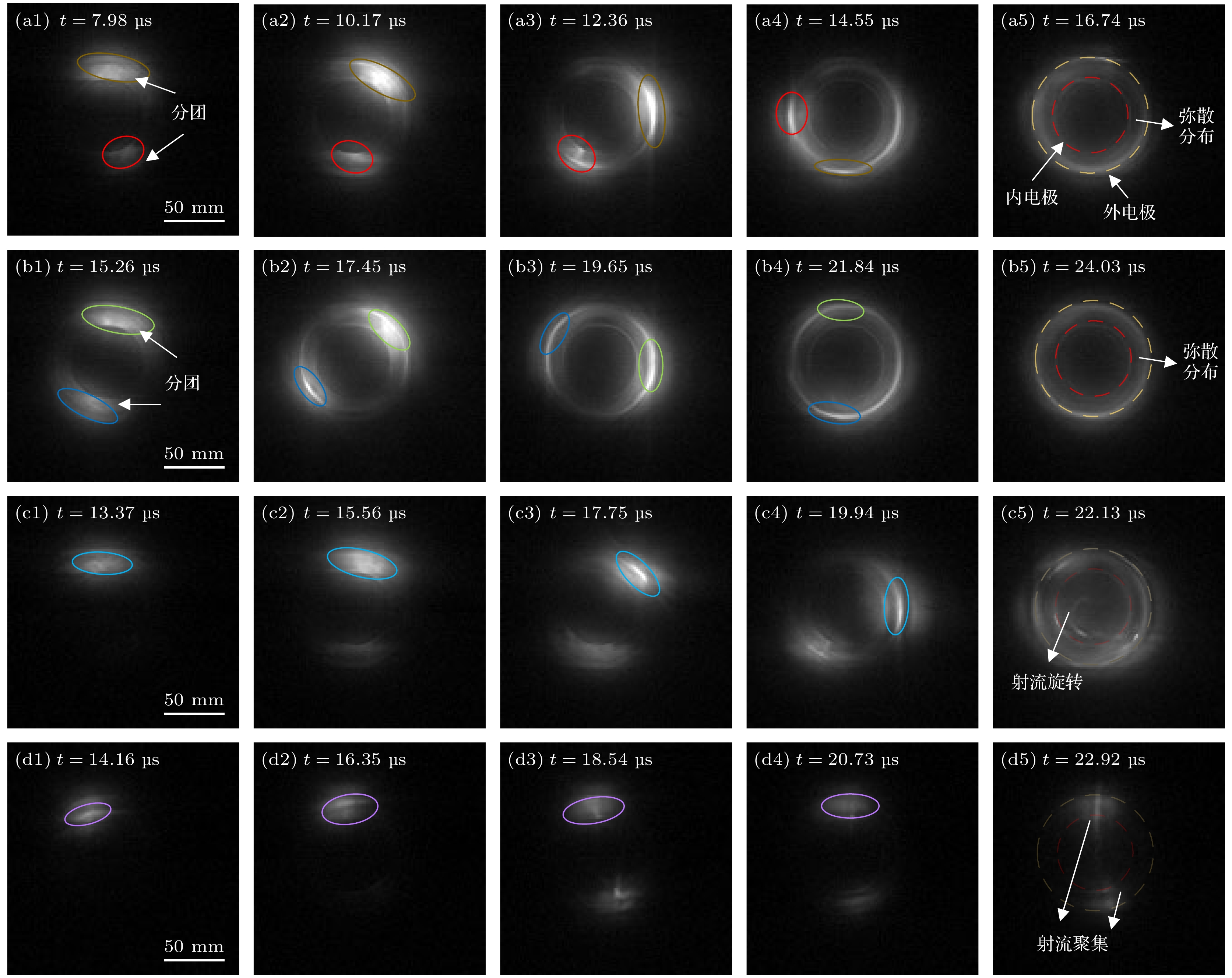 图 7  不同模式下的高速相机图像 (a) 球马克模式; (b) 扩散模式; (c) 射流模式1 (${{\varPsi }}$ = 1.42 mWb); (d) 射流模式2 (${{\varPsi }}$ = 0 mWb)