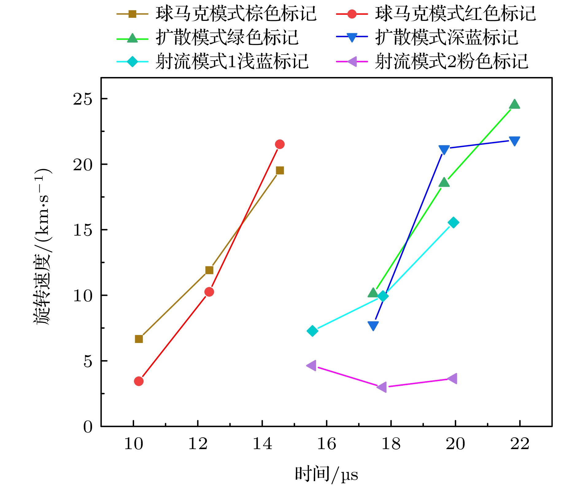图7图8可见, 在球马克模式下等离子体旋转速度逐渐增强, 图7(a5)图像显示等离子体已均匀弥散, 无明显亮区或分团, 表明其已达到稳定的匀速旋转状态. 扩散模式中, 旋转速度显著快于其他模式, 这是由于偏置磁场较强, 使得旋转更剧烈, 图7(b5)中弥散特征与球马克模式相似. 射流模式下, 旋转速度最小, 随着偏置磁场的减弱而递减; 在没有施加偏置磁场的射流模式2下, 旋转速度几乎不再变化.