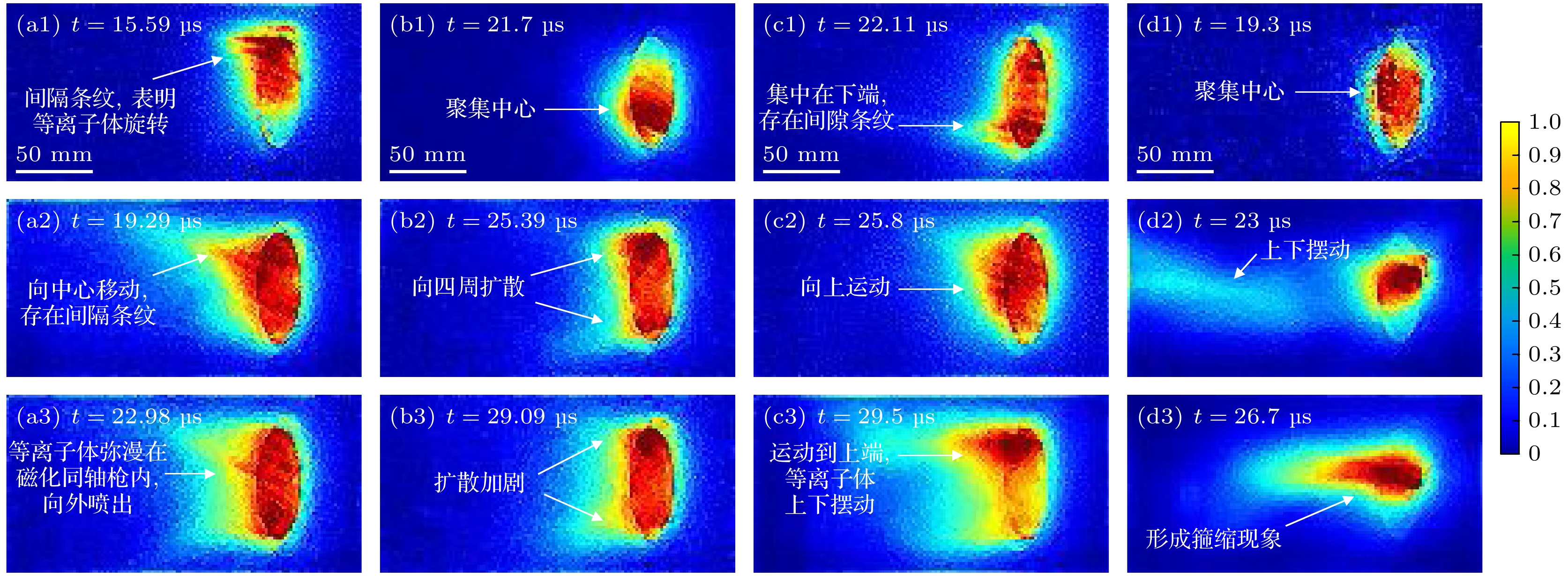 图9展示侧拍下各模式等离子体轴向运动情况, 为了更清晰地展示等离子体在不同状态下的动态结构, 采用MATLAB软件对原始图像进行伪彩处理.