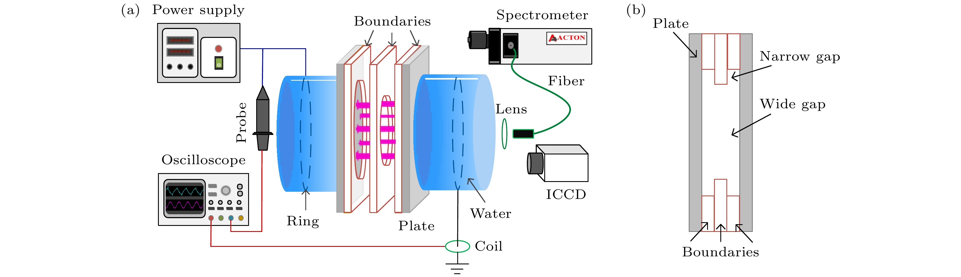 实验装置示意如图1(a)所示. 其包括放置在真空罐中的双水电极、高压交流电源和信号采集系统. 水电极由直径为75 mm的圆柱形容器构成, 圆柱形容器两端用1 mm厚的石英玻璃板密封, 装满水. 两个铜环分别被嵌入两个水电极内, 分别用来连接正弦交流电源和地线. 正弦交流电源峰值电压范围为0—10 kV, 频率为30—70 kHz可调, 本实验中频率固定58 kHz. 在两个并排放置的水电极之间插入3个半径分别为25 mm, 20 mm, 25 mm的圆形石英玻璃框架, 石英玻璃框架厚度均为1 mm, 其叠加形成边界, 边界内为放电区. 实验时, 3个石英玻璃框架贴紧并被固定在两个石英介质板中间压紧, 如图1(b)所示侧视图, 其中气隙为3 mm的为厚气隙, 气隙1 mm的为薄气隙. 整个放电装置置于一个密封的真空罐内, 其内部充有氩气(体积分数为75%)和空气(体积分数为25%)的混合气体, 实验时压强设置为25 kPa. 为了确保气隙内的气体浓度和压强与真空罐中一致, 在进行实验前均会将放电装置在真空罐中静置一段时间再进行实验研究. 外加电压和放电电流分别由高压探头(Tektronix P6015A)、电流探头(Tektronix TCPA 300)测量, 其波形通过示波器(Tektronix DPO4104)显示和记录. 放电图片由数码相机(Canon EOS 5D)和ICCD(Andor DH334 T)拍摄. 拍摄ICCD图像时, 利用同步触发装置将激励DBD的正弦信号转换为与之同步的晶体管逻辑(transistor- transistor logic, TTL)信号触发ICCD, 实现ICCD快门和放电的精确同步. 通过调节ICCD的延迟时间, 可以获得放电不同时刻的短曝光时间图像. 放电的发光信号经透镜汇聚后, 通过光纤(PI LG-455-020-1)传入光谱仪(PI ACTON SP2750), 采集放电的发射光谱.