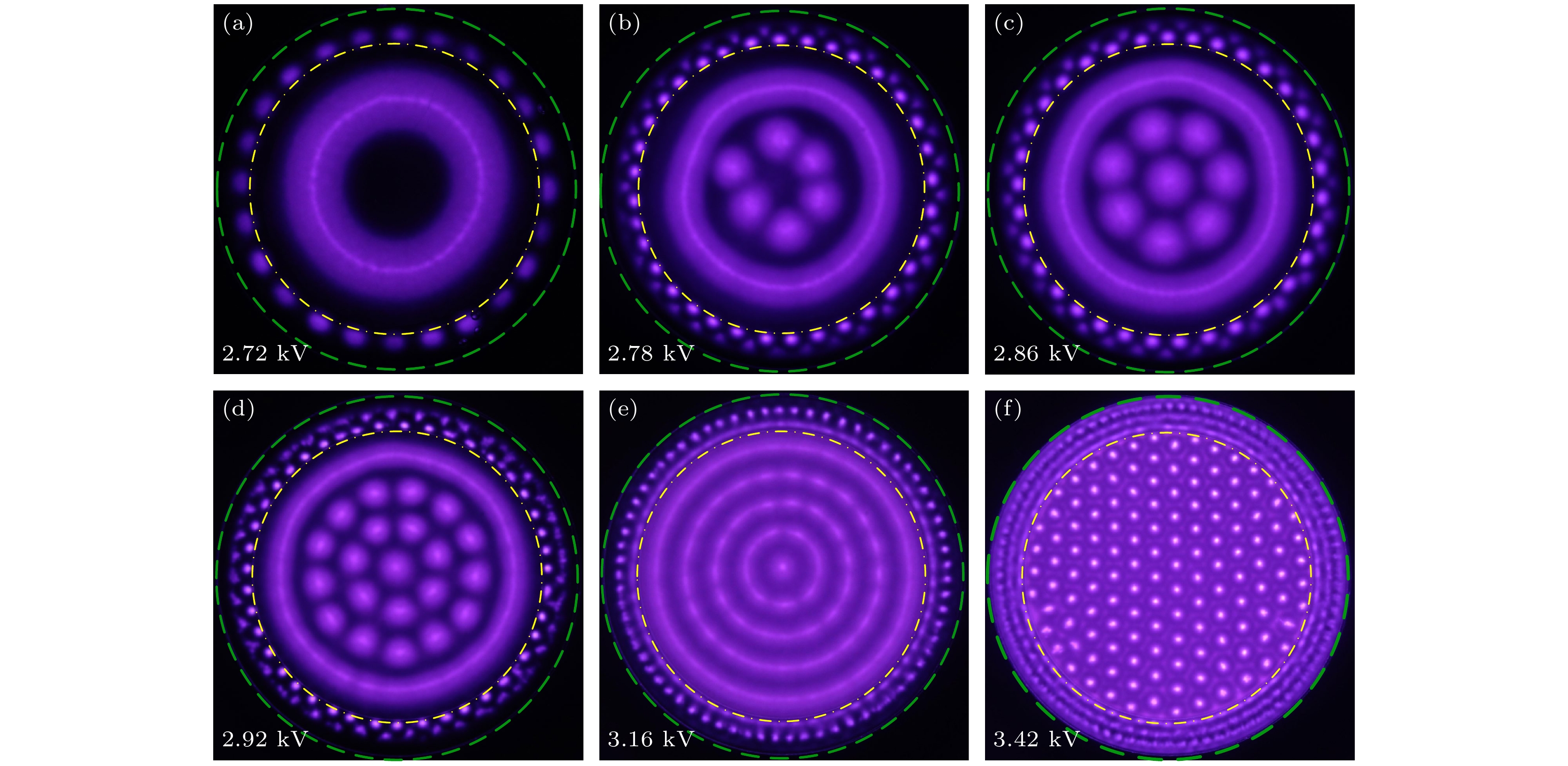 图 2 随着施加电压的增大, 实验观察到不同的等离子体结构 (a) 同心环斑图; (b)—(d) 环-点阵-同心环斑图; (e) 靶波斑图; (f) 蜂窝斑图