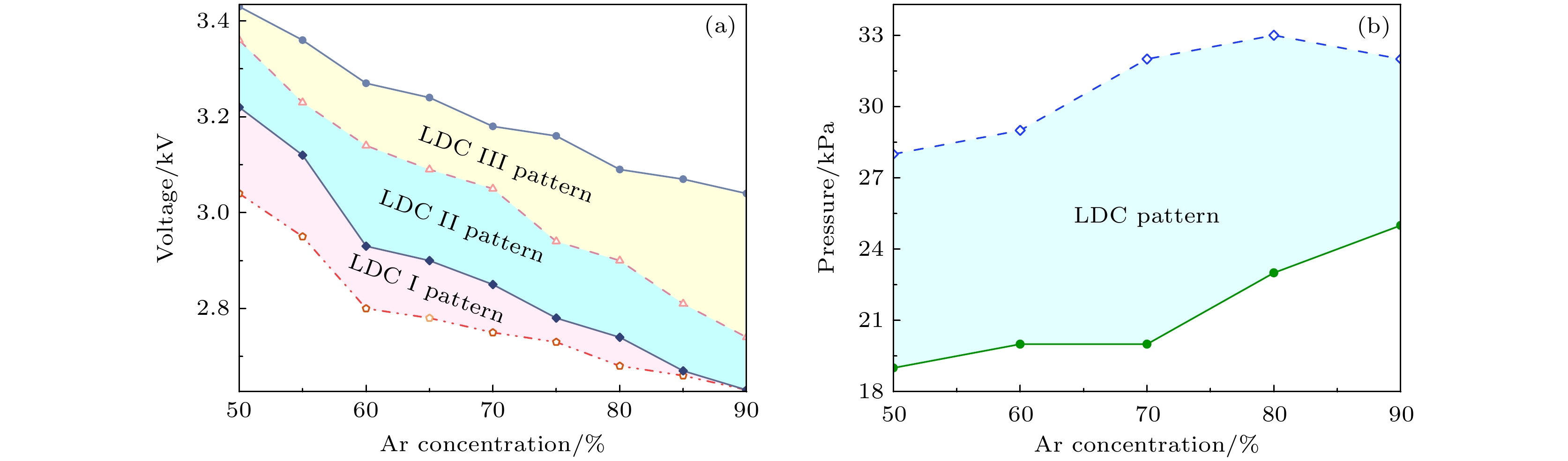 众所周知, 斑图对实验参数的变化相当敏感, 这对于其实际应用带来了困难[13–20]. 因此, 掌握斑图的调控参数对于实际应用非常重要. 图3(a), (b)是LDC斑图随氩气浓度、外加电压和气体压力变化的相图. 可以看出, 随着氩气浓度的增加, LDC Ⅰ斑图电压的变化范围变窄, LDC Ⅲ斑图电压的范围变宽. LDC斑图可以在很宽的气体压力和氩气浓度范围内实现, 当氩气浓度为50%—90%, 气压在19—33 kPa范围内都可以观察到LDC斑图, 这说明该斑图可调控范围大, 易于实际应用. 实验中氩气浓度为75%, 空气浓度为25%, 气体压力为25 kPa时产生斑图状态最为稳定, 因此选择在该条件下深入研究其内在机理.