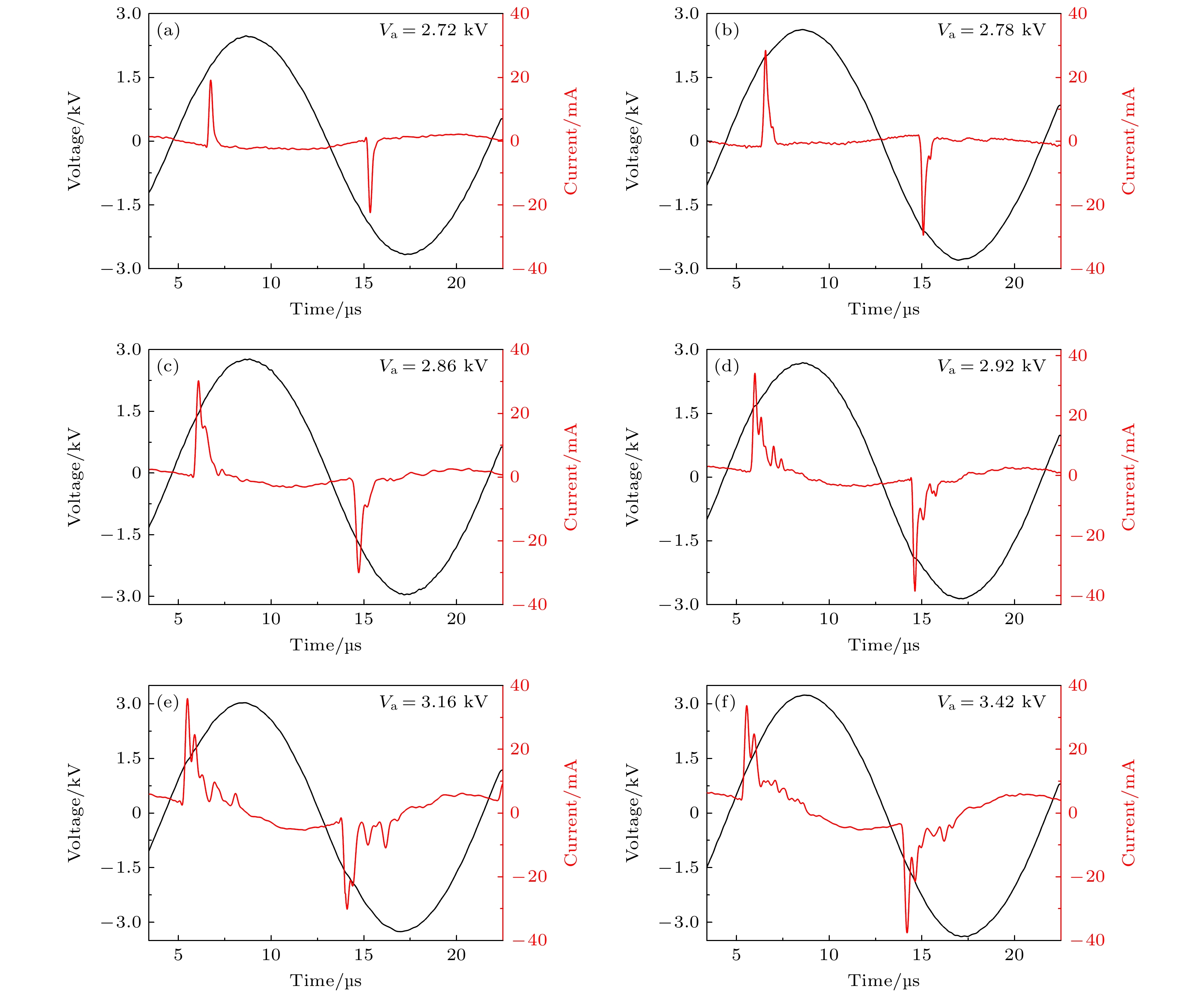图4(a)—(f)所示为与图2(a)—(f)对应的外加电压和放电电流波形. 通过分析发现, 当Va达到2.72 kV时, 即在同心环斑图中, 每半周期只有一个电流脉冲(图4(a)). 对于LDC斑图, 增大Va, 电流脉冲幅值显著增大, 并且在第1个电流脉冲下降沿出现了一个小的驼峰(图4(b)), 这是由于外加电场和内建电场的相互作用, 使得气隙被二次击穿, 但放电微弱. 随着Va继续增大, 驼峰强度逐渐增大, 并随着Va的升高击穿次数增多, 导致电流脉冲数量增多, 如图4(b)—(d)所示. 虽然电流信号随Va增大而变化, 但是实验发现图4(b)—(d)的电流信号具有相同的规律, 即电流脉冲数随着Va的升高增多, 而第1个脉冲的幅值始终最大, 这验证了前面提到的图2(b)—(d)的宏观结构相似的说法. 而对于靶波斑图和蜂窝斑图来说, 电流脉冲依旧是第一个脉冲的幅值最大, 但是电流脉冲的信号明显较LDC斑图强得多. 观察图4(a)—(f)可以发现, 随着Va增大, 在电压零值时刻, 电流不为零, 而且Va越高, 电压零值时刻的电流越大, 且电流与电压的相位差也随之增大. 这是由于气体被首次击穿之后, 电子和正离子会分别附着在瞬时阳极和瞬时阴极附近, 并形成与外加电场方向相反的面电荷场(内建电场); 随着放电的增强, 面电荷场产生的内建电场迅速增大, 使净电场(内建电场和外加电场的和)迅速降低, 当放电气隙内的总电场小于维持放电所需要的电场时, 放电熄灭. 当外加电压Va幅值较小时, 放电仅击穿一次. 当Va升高, 放电击穿一次熄灭后, 外加电场继续升高使净电场又高于击穿电场, 产生二次放电甚至是多次放电, 放电在电压峰值附近熄灭; Va越高, 放电次数越多, 放电熄灭越晚, 存活到下半个周期的面电荷越多, 面电荷产生的内建电场对下半个周期的放电促进作用越强, 放电首次击穿时间越早, 电流与电压的相位差越大. 由于放电熄灭后, 外加电压降低, 外加电场减小, 使内建电场大于外加电场, 净电场的方向反转; 当电源极性还未反转时, 电流方向已经翻转, 导致在电压为零的时刻放电区域内总电场不为零, 有微电流存在. Va越大, 面电荷产生的内建电场作用越强, 微电流越强, 因此电流偏离0的位置也随之增大.