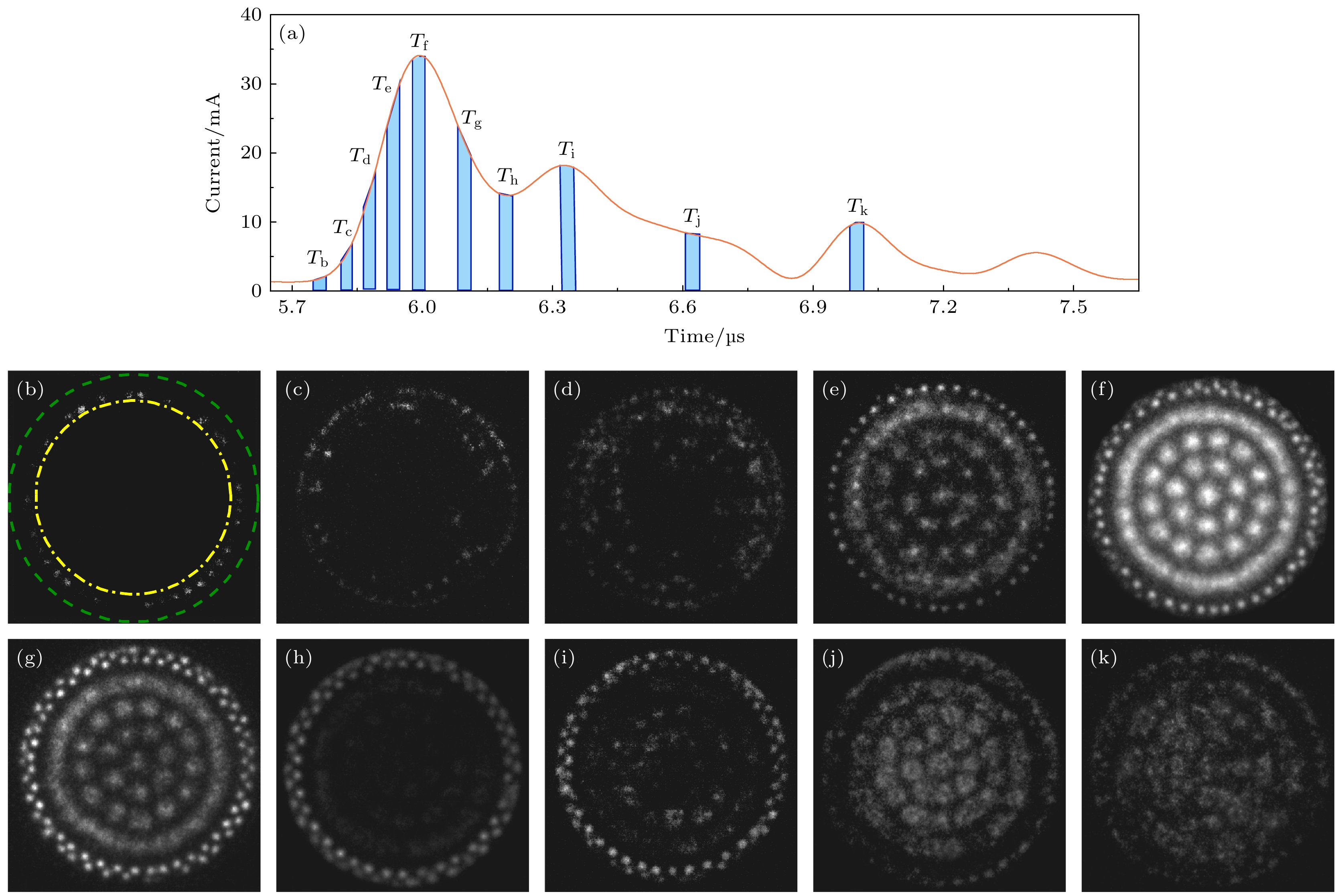 为了探究LDC斑图的时空演化过程, 以图2(d)中拍摄的LDC Ⅲ斑图为例, 利用ICCD相机对其进行单次短曝光时间(曝光时间texp = 50 ns)的拍摄. 如图5(a)所示波形图为图4(d)对应的电流脉冲的局部放大图. 图5(b)—(k)为放电期间拍摄的单次放电图像, 其拍摄时刻分别对应图5(a)波形图上Tb—Tk时刻. 从图5(b)可以看出, 在放电的起始阶段, 薄气隙处最先被击穿放电; 随着电流的增大, 放电逐渐呈现出沿着径向由外向内发展的趋势(图5(c)—(e)), 并在Te时刻发展至圆心, 如图5(e)所示, 此时, 放电十分微弱. 此后, 放电逐渐增强, 并在电流峰值Tf时刻光强达到最大, 此时放电发光也最强, 如图5(f)所示. 之后随着电流的衰减, 放电逐渐减弱(图5(g)). 在Th时刻, 厚气隙放电几乎完全熄灭, 但薄气隙放电比厚气隙放电要强烈(图5(h)). 当外加电压持续升高, 气体再次达到击穿阈值, 厚气隙处产生二次放电, 薄气隙处放电也增强, 但放电较第1次放电弱得多(图5(i), (j)), 随后放电随着电流的减小而逐渐减弱(图5(k)). 从半个周期内拍摄的ICCD放电图像(图5(b)—(k))可以看出, LDC斑图各个放电通道并不是同步被击穿的, 而是呈现出由外向内径向发展的过程, 这与大面积辉光放电在径向上呈现由内向外的发展过程相似[39,40].