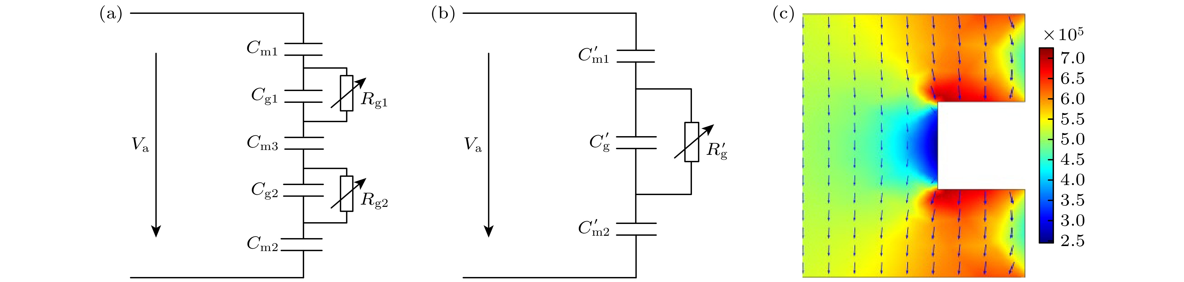$C_{\rm g}'$ 可由平板电容公式计算得到, 在该实验条件下Cm1 = Cm2 = Cm3 = Cm, Cg1 = Cg2 = Cg,$C_{\rm m1}' = C_{\rm m2}' = C_{\rm m}' $ . 击穿电场(E)可由(3)式得到:根据计算得到薄气隙的E约为709 kV/m, 厚气隙处的E约为330 kV/m, 这与图6(c)中静电场仿真结果相吻合. 在薄气隙和厚气隙的过渡区域, 由于边界的极化作用, 导致此处电场不均匀, 如图6(c)所示. 击穿首先会发生在极不均匀电场处, 根据气体放电理论, 电场强度大的地方先放电, 因此放电首先出现在薄气隙和厚气隙交界附近的薄气隙中(图5(b)). 薄气隙被击穿后, 形成微放电. 在靠近瞬时阳极的薄气隙和厚气隙的过渡区域, 由于不均匀电场的作用, 产生一个沿径向向外的横向电场(Ex). 电子由于受到纵向场(Ey)的作用向瞬时阳极移动, 然后在Ex的影响下, 瞬时阳极附近的电子迅速沿着径向向内横向迁移, 这导致厚气隙与薄气隙边界附近出现较多电子. 这些电子对于厚气隙中的气体起到了预电离作用[42], 因此随着外加电压持续升高, 在厚气隙的边界附近首先击穿发生放电. 由于面电荷的沉积和电子的迁移是同时发生的, 面电荷场的存在会削弱放电周围空间的总电场, 放电会在距离厚气隙边缘一段距离处先产生. 当外加电压持续升高, 厚气隙中放电逐渐沿径向向内发展.