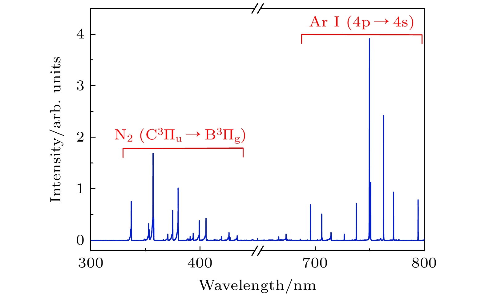 图7所示为LDC Ⅲ斑图在300—800 nm范围内的发射光谱. 典型的谱线包括氮分子第二正带系N2(C3Πu→B3Πg), 以及696.9—794.8 nm范围内对应Ar Ⅰ(4p→4s)的发射谱线. 本文利用N2(C3Πu→B3Πg)谱线带进行玻尔兹曼拟合, 计算了分子振动温度(Tv)[43]. 利用Ar Ⅰ的738.4 nm和750.4 nm谱线的强度比可表征ne的变化趋势, 750.4 nm和751.5 nm谱线的强度比可表征Te的变化趋势[44].