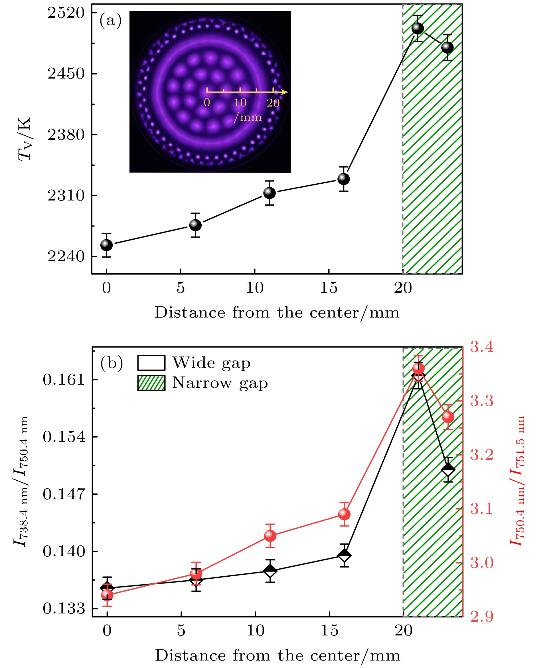 对中心点以及距中心点分别为6, 11, 16, 21, 23 mm的放电细丝的发射光谱进行空间分辨测量, 进而得到其等离子体参数. 图8(a)所示为不同位置的Tv, 图8(b)所示为不同位置的ne和Te的变化趋势. 可以看出, 薄气隙中Tv, ne及Te比厚气隙中Tv, ne及Te大得多. 在薄气隙中, 靠近厚气隙边缘位置的Tv, ne及Te较大. 在厚气隙中, 随着距中心点距离的增大, Tv, ne及Te都略有升高, 但数值上差距较小.