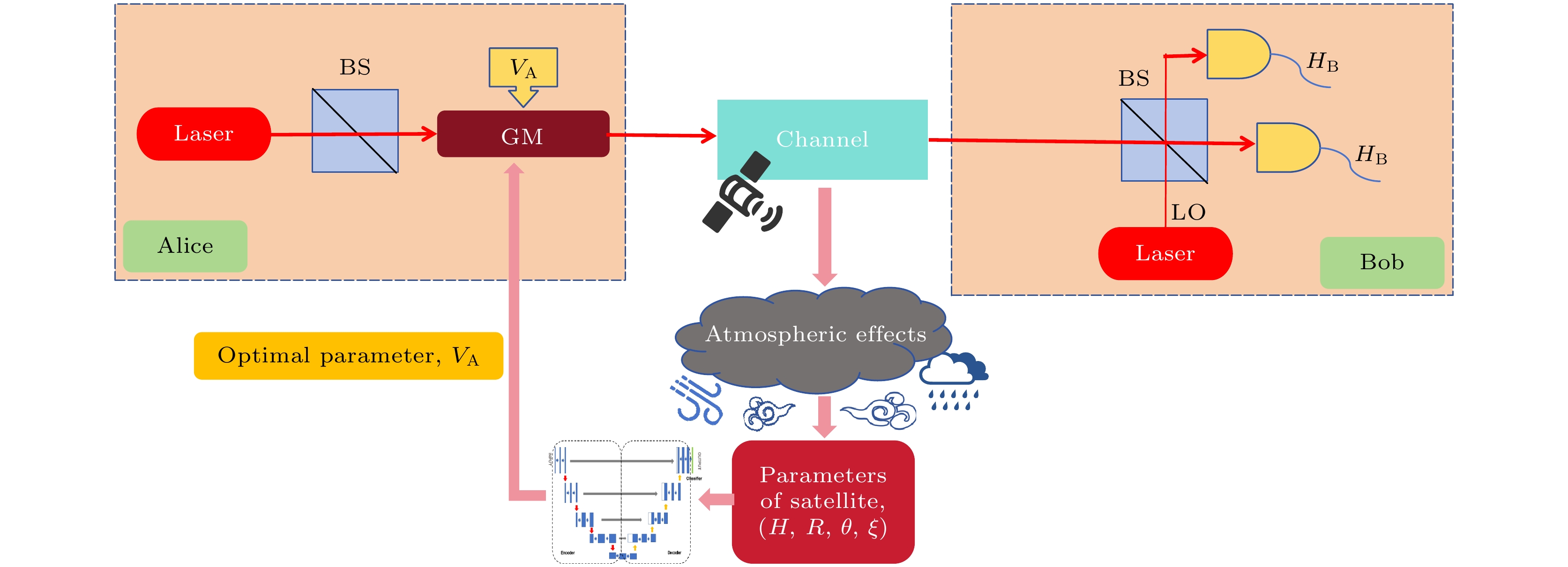 $ V_{\mathrm{A}} $ 强度; 信号经分束器(beam splitter, BS)耦合后, 通过空间信道下行传输至地面站Bob. Bob 端利用本振光(local oscillator, LO)进行零差检测, 在信道透射率 HB (channel transmittance at Bob)约束下完成量子态测量, 实现量子密钥分发.由于湍流、雨雾等大气效应会对信号传输造成干扰, 这些干扰因素使得大气信道中的动态参数, 如信道增益、相位变化等, 处于持续变化的状态, 使得传统参数优化预测方法确定的调制方差