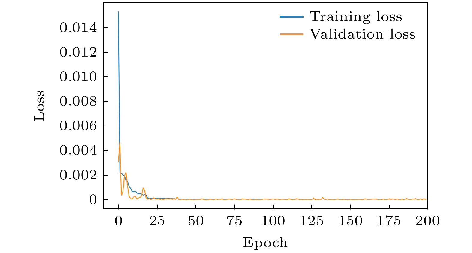 图3所示为Unet网络在200个训练周期(epoch)中的训练损失和验证损失变化情况, 损失函数采用均方误差(MSE), 其值的降低直接反映了模型预测精度的提高, 表明模型能够有效拟合训练数据并准确预测验证数据. 图中蓝色曲线代表训练损失, 橙色曲线代表验证损失. 在训练初期, 损失值迅速下降, 这表明模型正在快速学习数据中的模式. 具体来说, 在前10个epoch内, 训练损失从大约0.014降至0.002以下, 验证损失也从大约0.004降至0.002以下. 随着epoch的增加, 损失值继续下降, 直到大约20个epoch后, 损失值趋于稳定, 训练损失和验证损失均接近0.0005, 且两者之间的差距较小. 这表明模型在训练集和验证集上都具有良好的泛化能力, 未出现明显的过拟合现象. 最终, 训练损失和验证损失均稳定在0.0005左右, 显示出模型已经收敛, 并且在训练和验证数据上都达到了较高的性能. 说明模型能够有效地学习数据特征, 并且在未见过的数据上也能做出准确的预测.