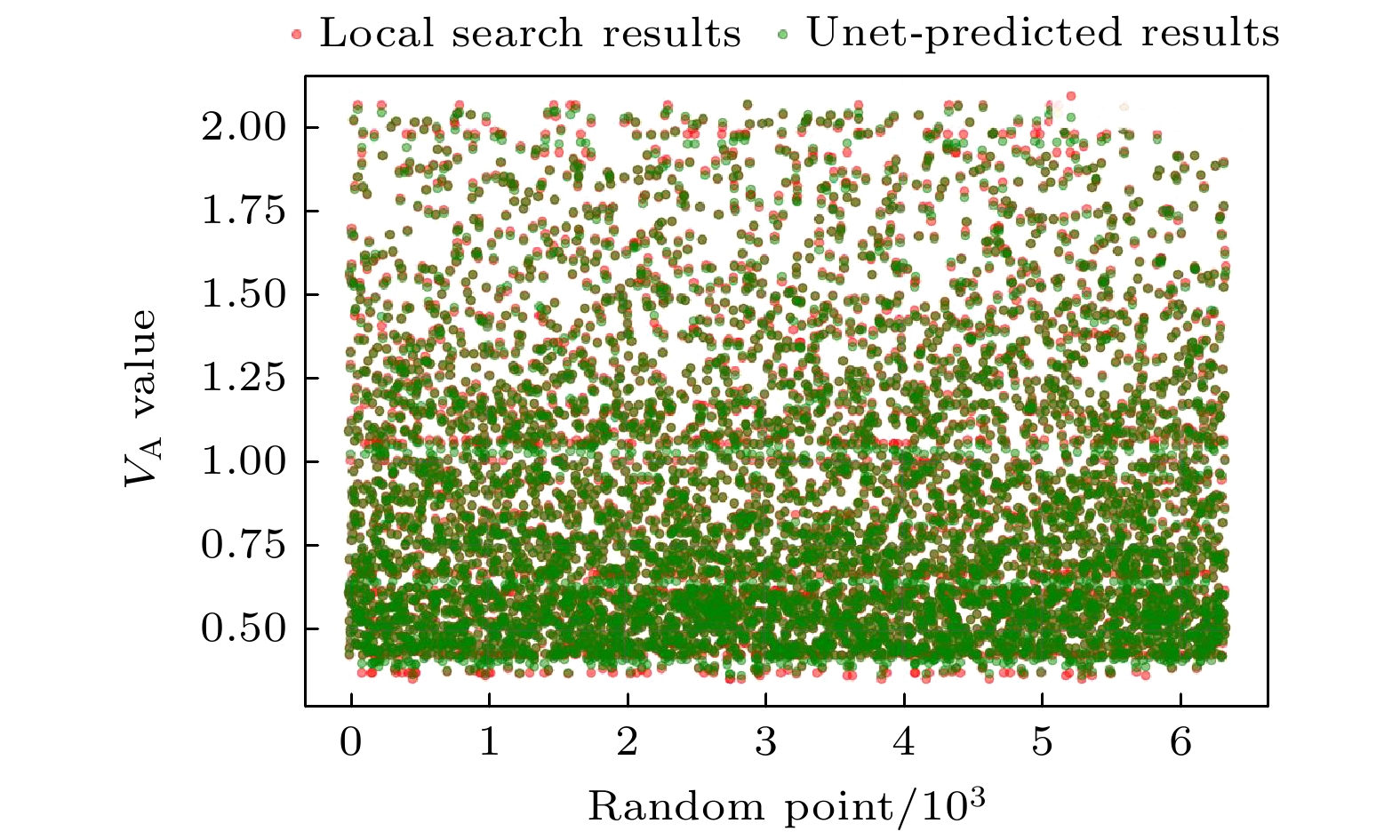 $ {V}_{{A}_{\mathrm{o}\mathrm{p}\mathrm{t}}} $ 方面具有较高的准确性. 如图4所示, 红色点代表通过GA算法计算出的$ {V}_{{A}_{\mathrm{o}\mathrm{p}\mathrm{t}}} $ 值, 而绿色点则表示Unet模型预测的$ {V}_{{A}_{\mathrm{p}\mathrm{r}\mathrm{e}\mathrm{d}}} $ 值. 从图4可以明显看出, Unet模型的预测结果与局部搜索算法的结果在大部分区域高度一致, 这表明Unet模型能够有效地替代局部搜索算法, 为CV-QKD系统提供快速而准确的调制方差预测. Unet模型$ {V}_{\mathrm{A}} $ 的低值区域(接近0.5)和中值区域(接近1.0)的预测结果与局部搜索算法的结果几乎完全重合, 显示出极高的预测精度. 在$ {V}_{\mathrm{A}} $ 值较高的区域(接近2.0), 存在轻微的过预测现象, 但不影响其整体的预测性能.与传统的局部搜索算法相比, Unet模型不仅在预测准确性上表现出色, 而且在计算效率上具有相对优势. 这使得Unet模型在实际应用中能够快速响应系统需求, 为CV-QKD系统的实时优化提供支持: