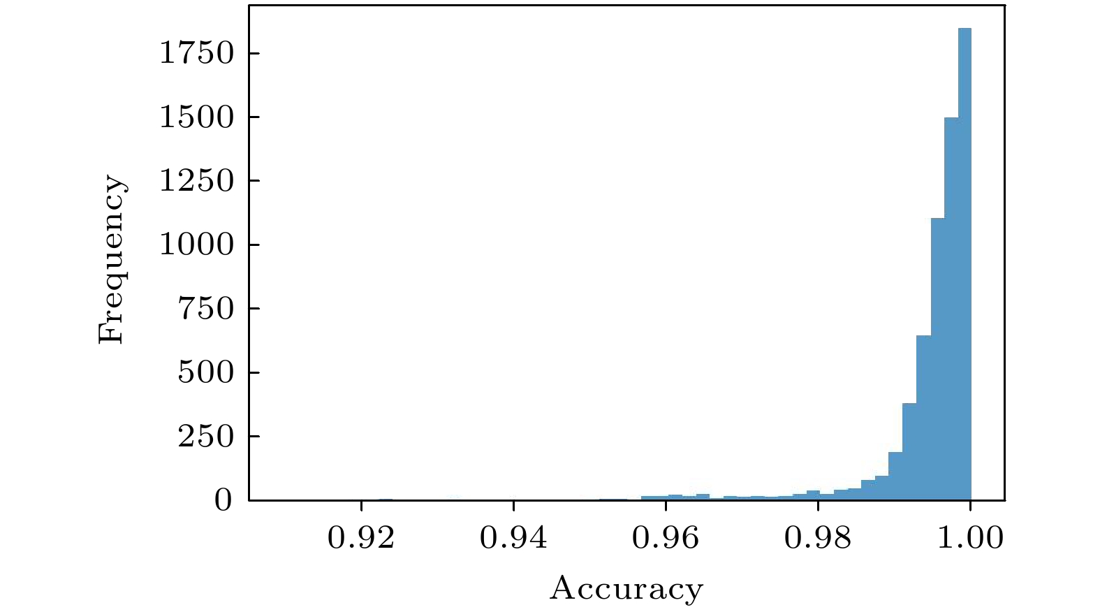 通过准确率计算公式计算, Unet网络的预测结果与局部搜索算法的结果高度一致, 最高准确率达到99.41%, 平均准确率为99.37%, 标准差仅为0.000045. 如图5所示, 大部分数据点的准确率集中在接近1.00的区域, 表明模型的预测结果与真实值高度一致. 准确率在0.98到1.00之间的数据点数量最多, 频率超过1500次, 说明模型在大多数情况下都能生成非常精确的预测. 准确率分布呈现右偏(正偏态), 表明大部分数据集中在高准确率区域, 而低准确率的数据点较少. 在0.92—0.96之间的准确率区域, 数据点的数量非常少, 说明模型在这些区域的预测偏差较大, 但发生概率很小.